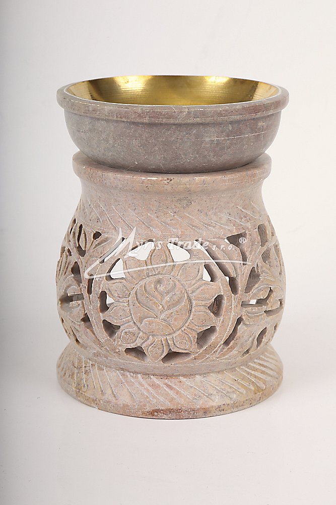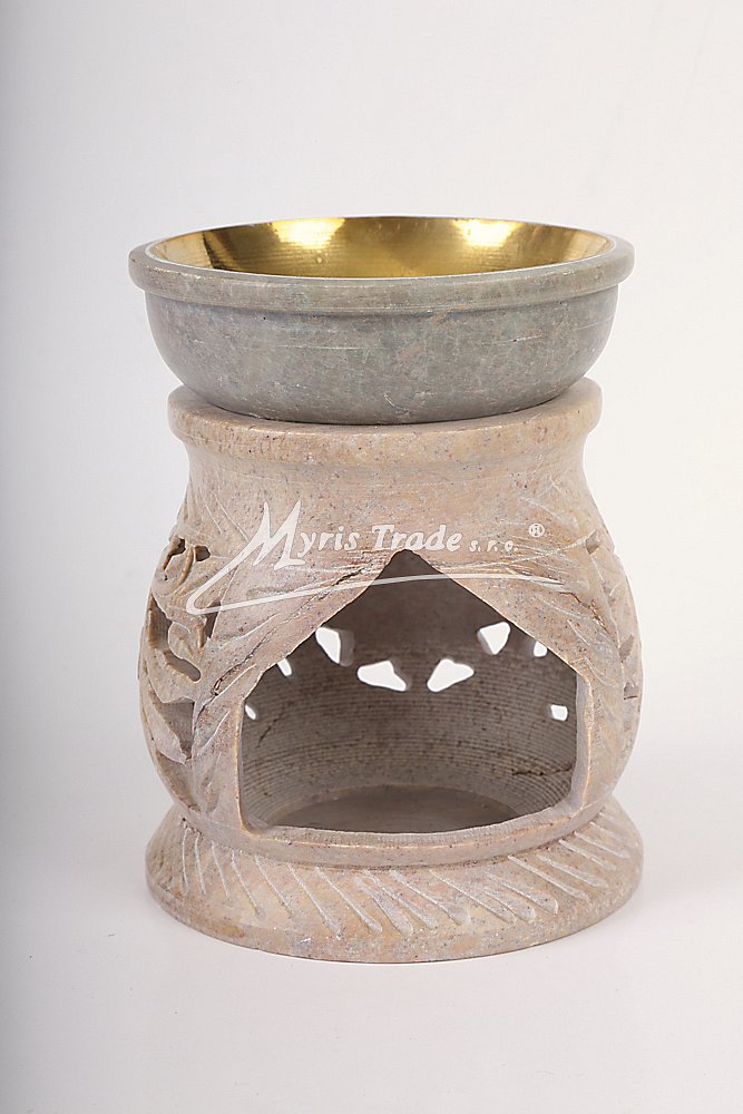 bohatě vyřezávaná aromalampa na čajovou svíčku a aromaolej je ručně vyrobena z mastku, jednoho z nejměkčích kamenů; miska na aromatickou kapalinu je vyložena mosazí, aby se zabránilo případnému prosakování kapaliny kamenem;