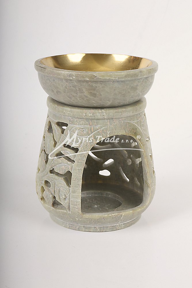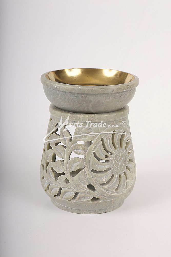 bohatě vyřezávaná aromalampa na čajovou svíčku a aromaolej je ručně vyrobena z mastku, jednoho z nejměkčích kamenů; miska na aromatickou kapalinu je vyložena mosazí, aby se zabránilo případnému prosakování kapaliny kamenem;