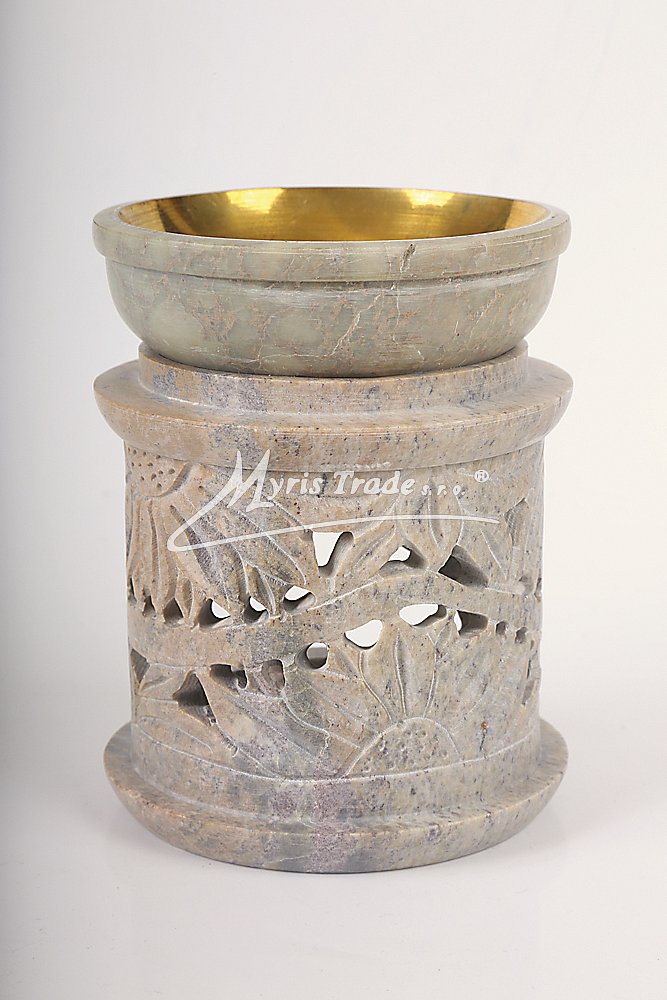 bohatě vyřezávaná aromalampa na čajovou svíčku a aromaolej je ručně vyrobena z mastku, jednoho z nejměkčích kamenů; miska na aromatickou kapalinu je vyložena mosazí, aby se zabránilo případnému prosakování kapaliny kamenem;