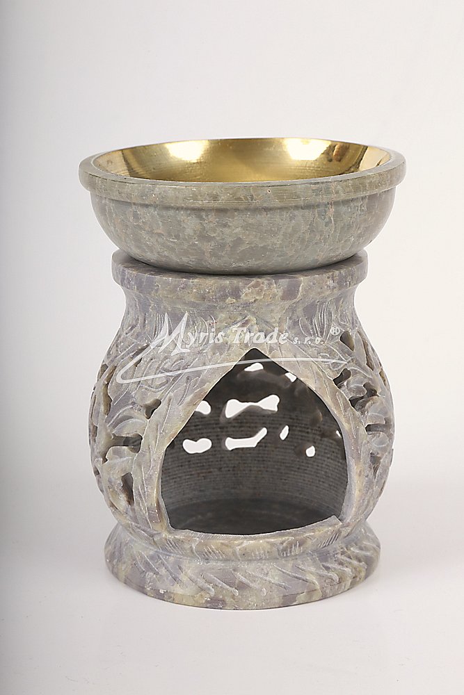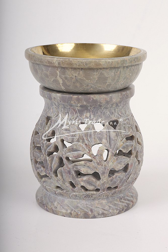 bohatě vyřezávaná aromalampa na čajovou svíčku a aromaolej je ručně vyrobena z mastku, jednoho z nejměkčích kamenů; miska na aromatickou kapalinu je vyložena mosazí, aby se zabránilo případnému prosakování kapaliny kamenem;