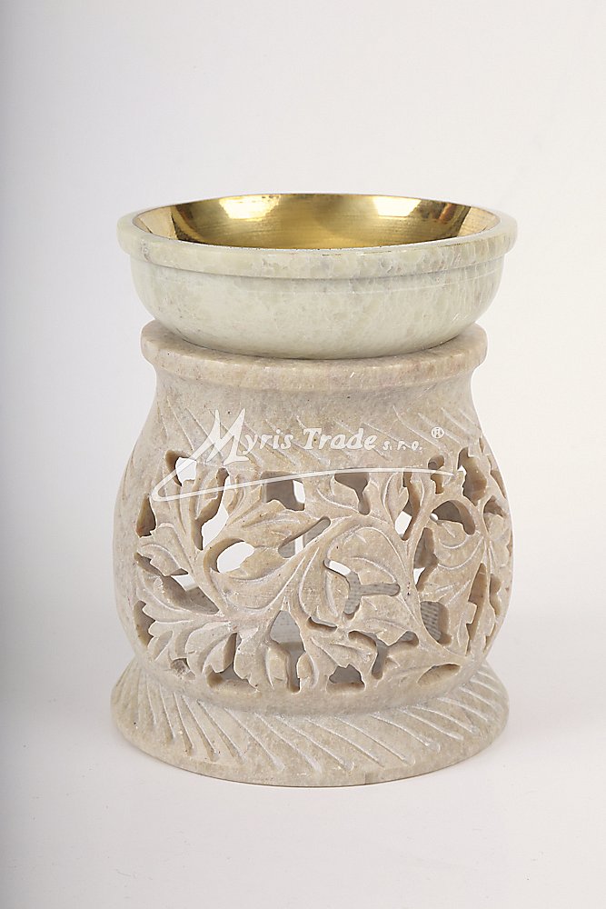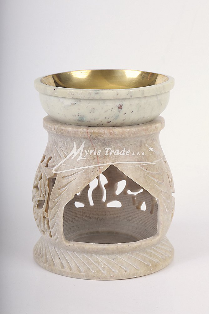 bohatě vyřezávaná aromalampa na čajovou svíčku a aromaolej je ručně vyrobena z mastku, jednoho z nejměkčích kamenů; miska na aromatickou kapalinu je vyložena mosazí, aby se zabránilo případnému prosakování kapaliny kamenem;