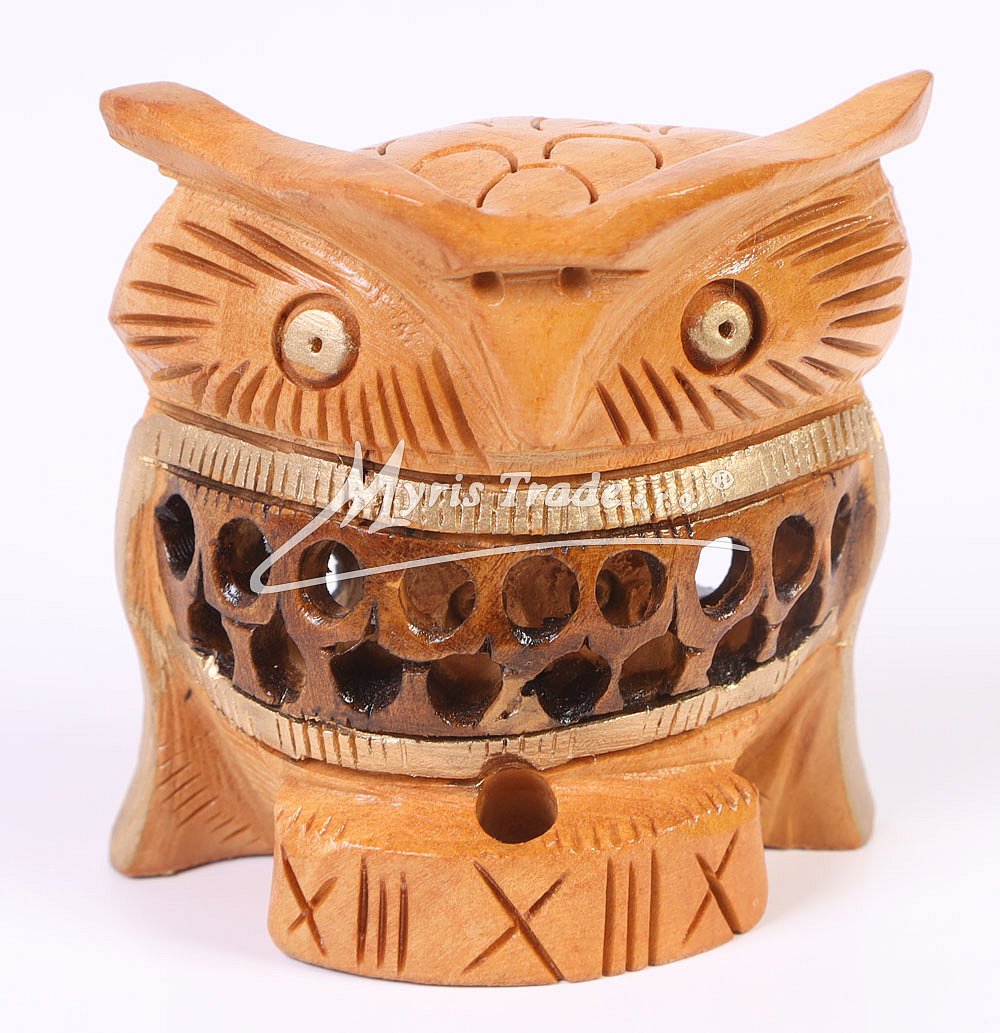 sova dřevěná - dutá, ručně vyřezávaná, světlé dřevo je kombinované proužkem tmavého dřeva, se zlatým zdobením pod hlavou, uvnitř těla sovy je vyřezaná malá sovička