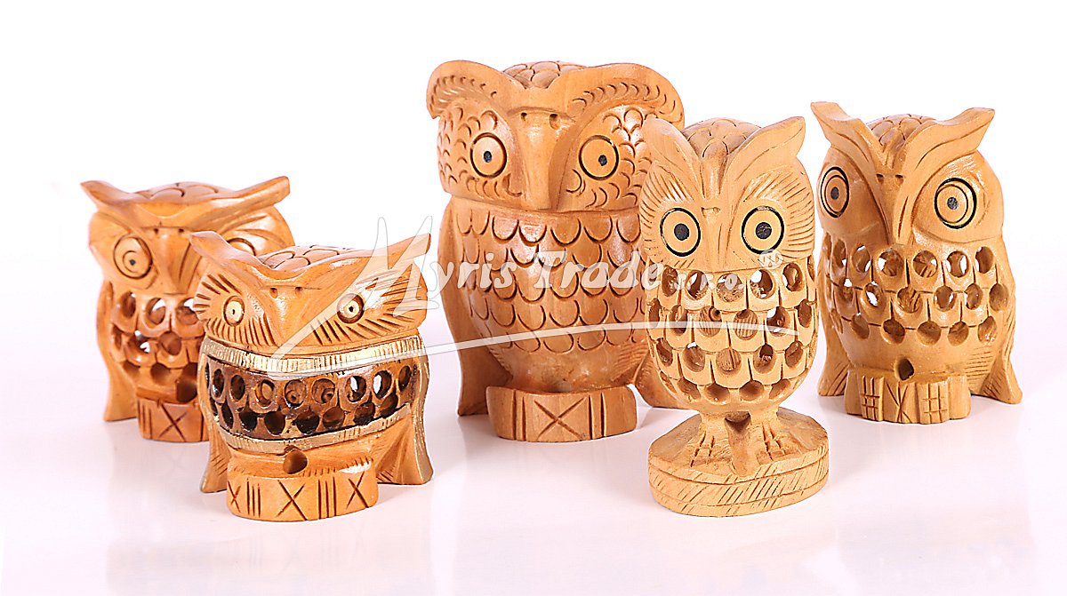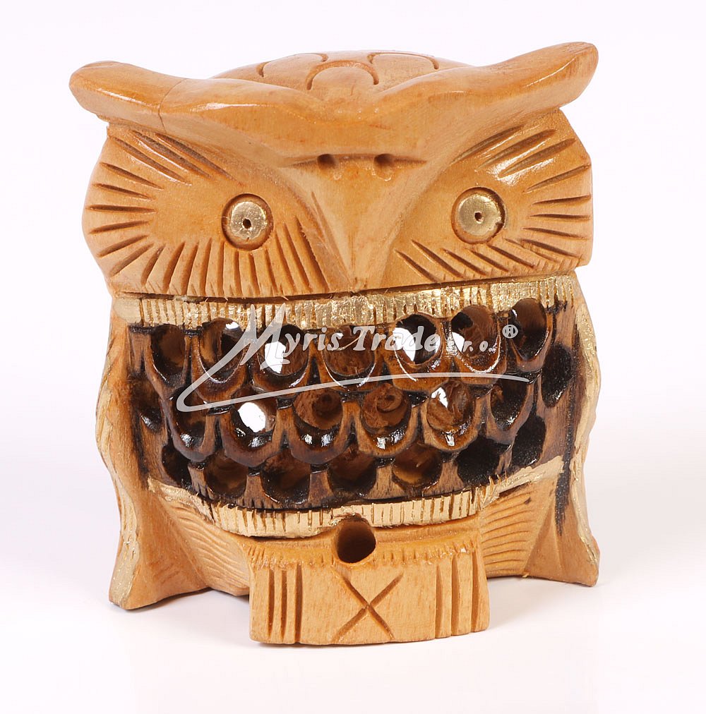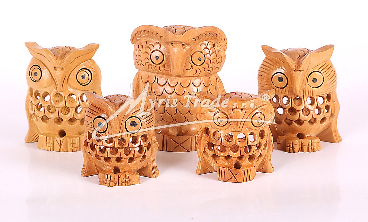 sova dřevěná - dutá, ručně vyřezávaná, světlé dřevo je kombinované proužkem tmavého dřeva, se zlatým zdobením pod hlavou, uvnitř těla sovy je vyřezaná malá sovička