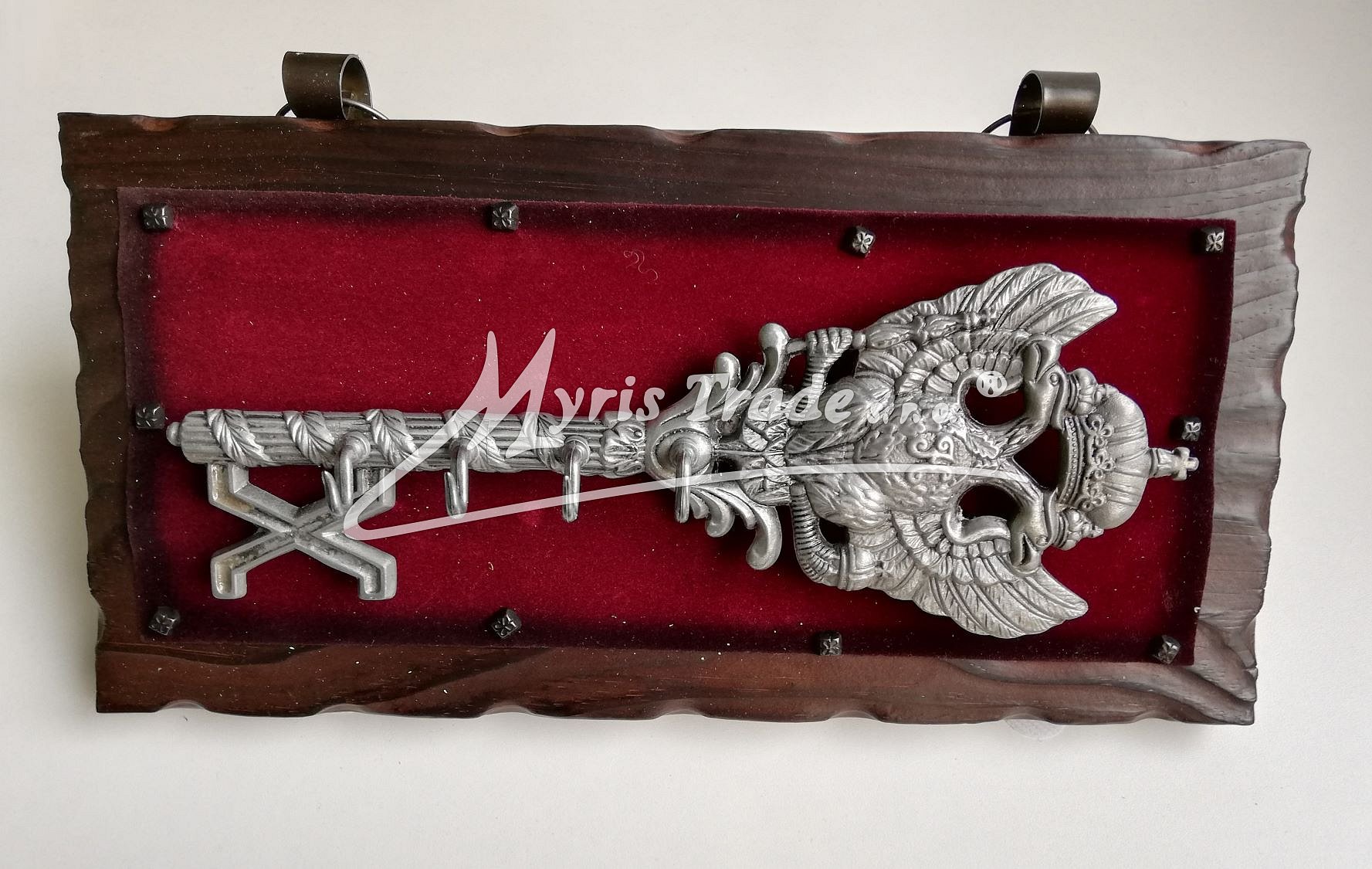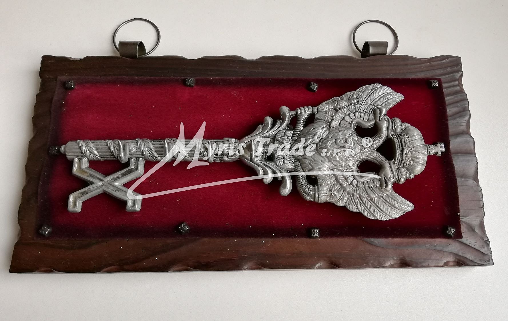 kopie historického ozdobného klíče z šedého kovu na dřevěné desce z masivního dřeva, potažené vínovým sametem; slouží jako dekorativní věšák na klíče; k zavěšení na zeď slouží dva kovové závěsy; klíč je zdoben stylizací Habsburského znaku