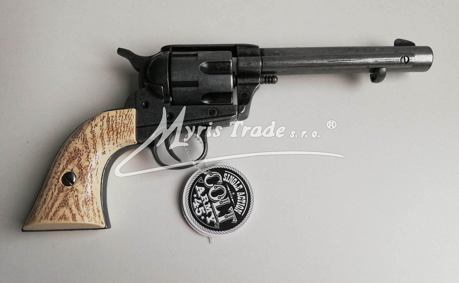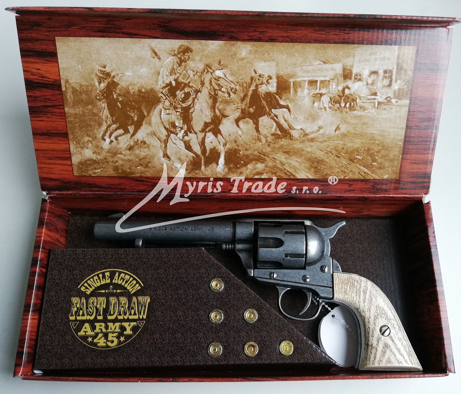 nefunkční replika revolveru ráže 45 s pažbou imitace slonové kosti, hlaveň a bubínek v barvě šedého kovu, balená ve stylové krabici s replikami nábojů