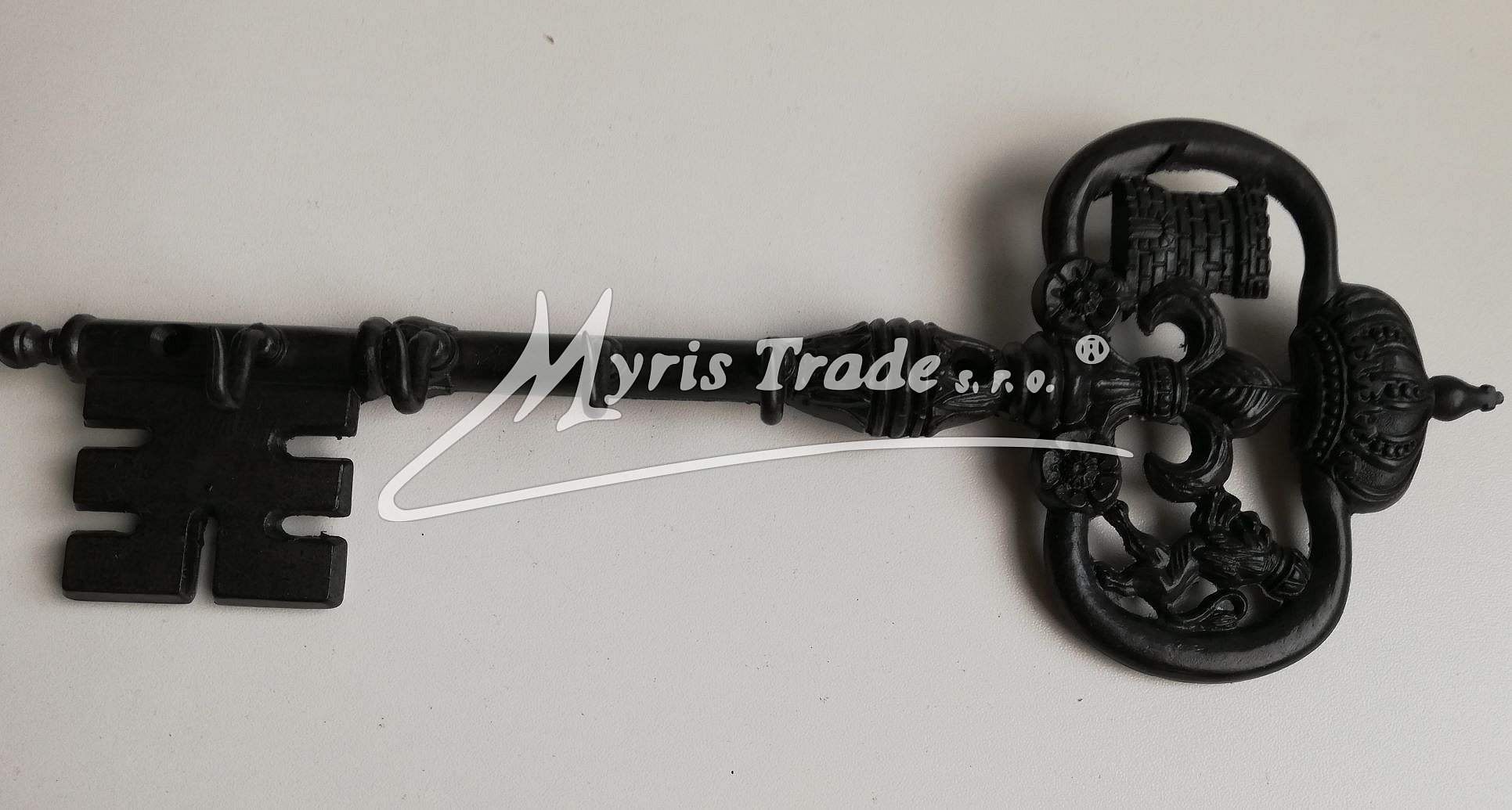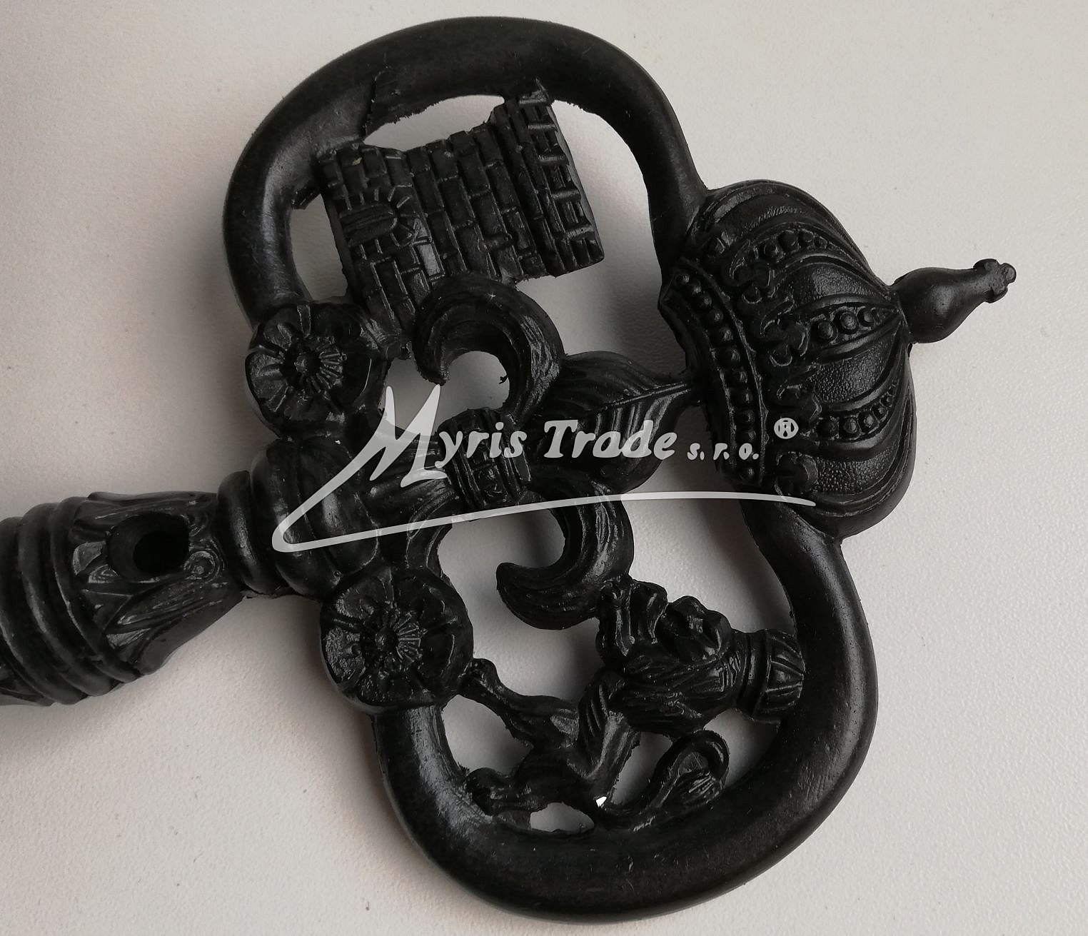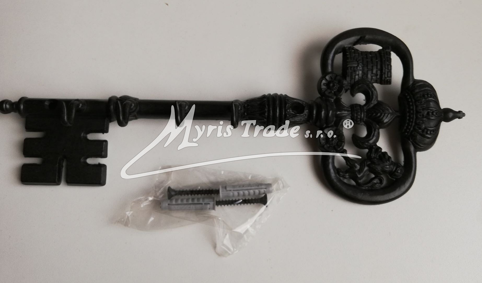 kopie historického ozdobného kovového klíče v černé barvě, který slouží jako dekorativní věšák na klíče; klíč je zdoben stylizací historických erbů; klíč je doplněn dvěma vruty a hmoždinkami k jeho případnému upevnění na zeď nebo dřevěný podklad