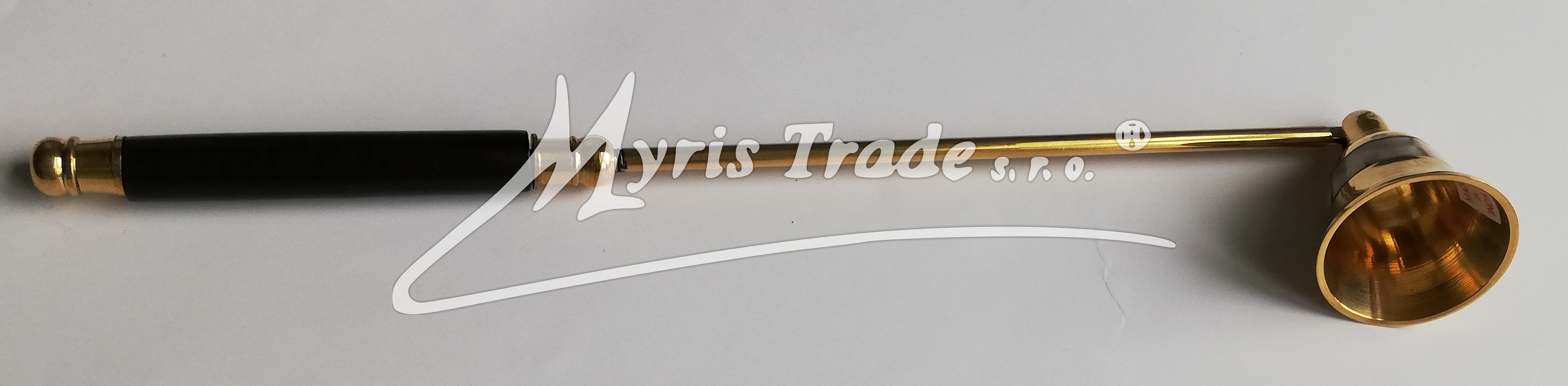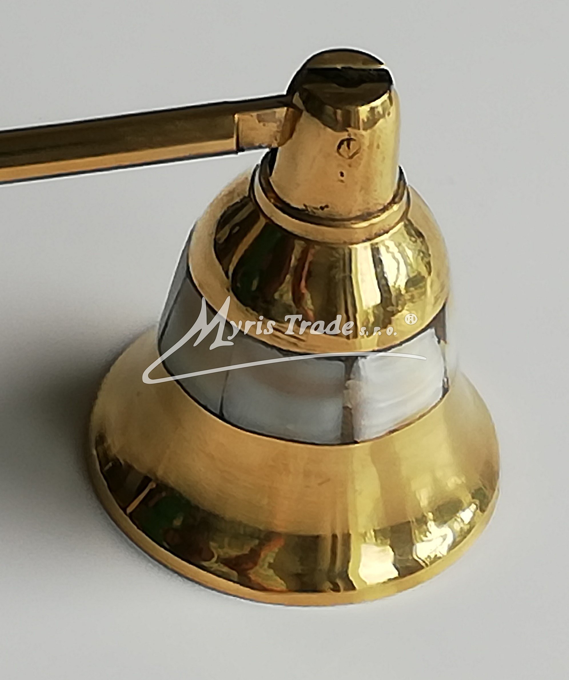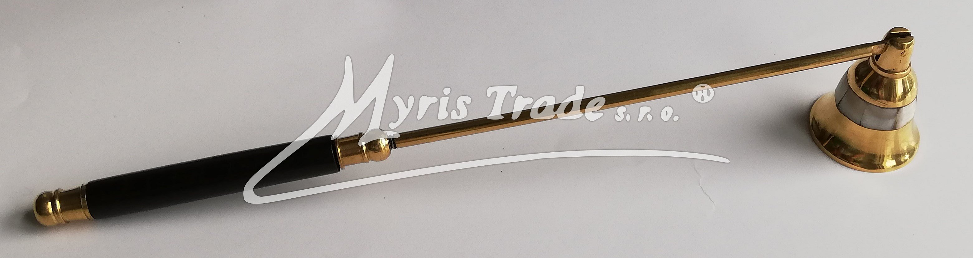 mosazné zhasínátko na svíčky ozdobené perletí s rukojetí doplněnou dřevěným držátkem