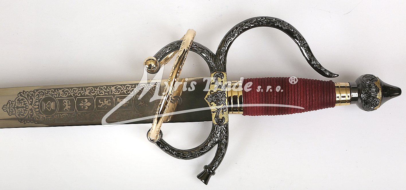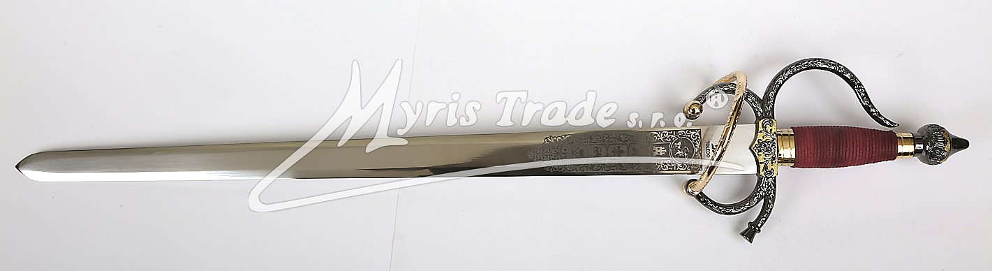 krátký ozdobný meč z kvalitní leštěné nerezové oceli v kombinaci s bohatě zdobeným kovem původem z Toleda