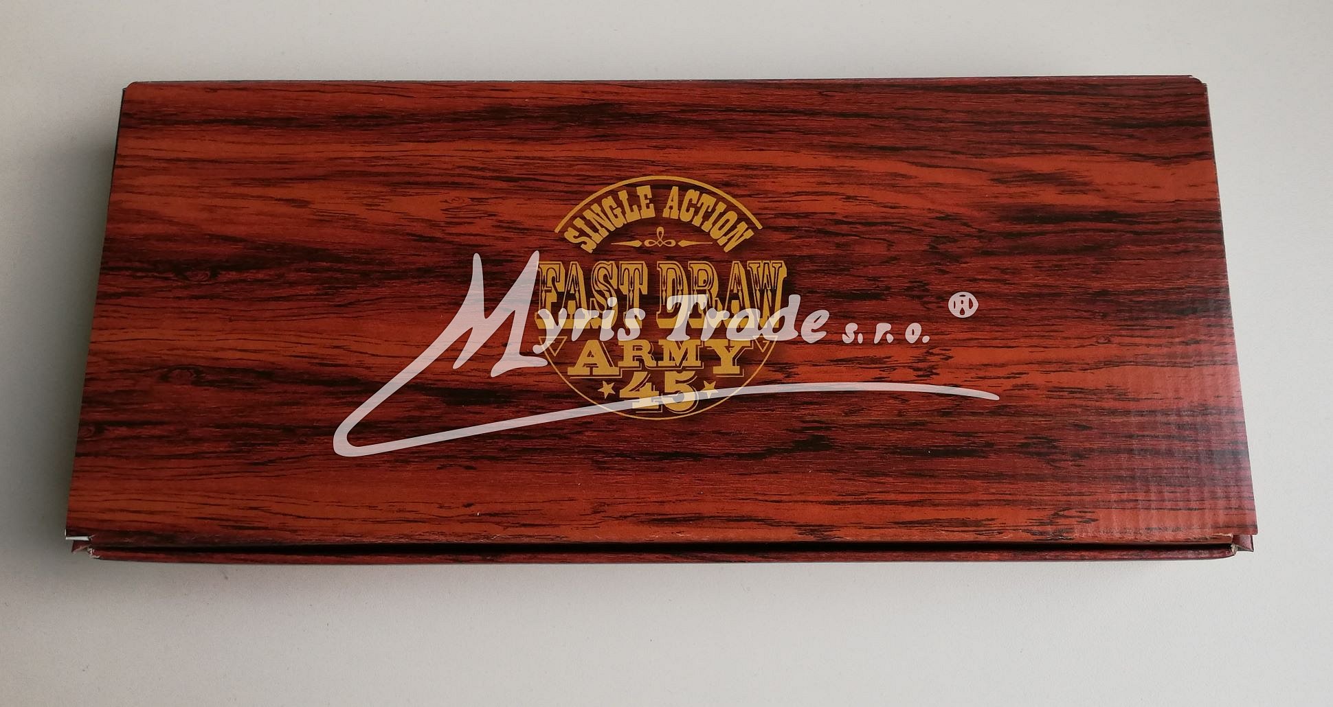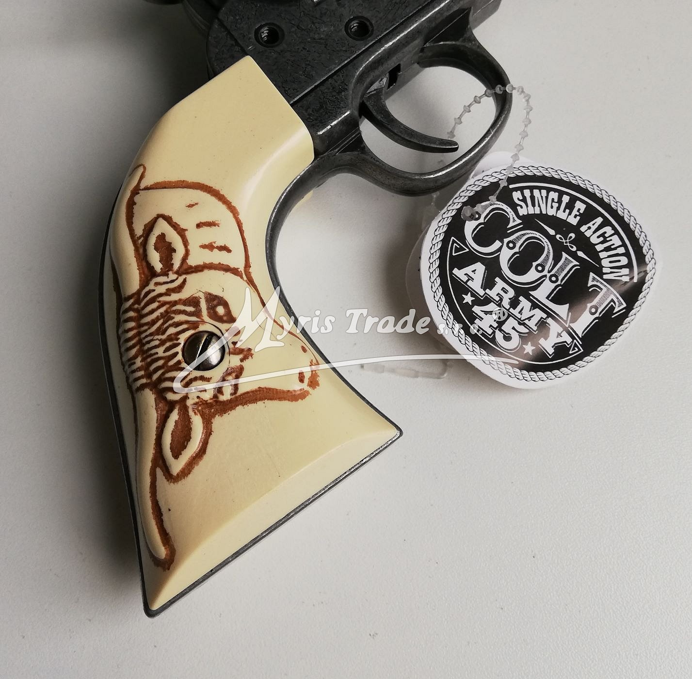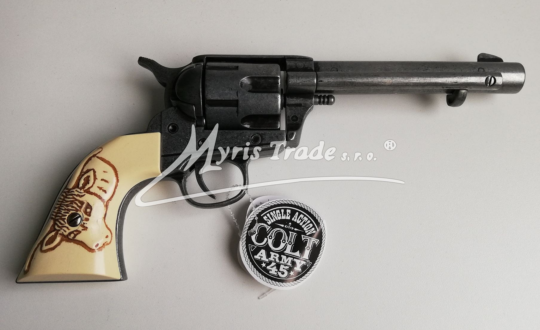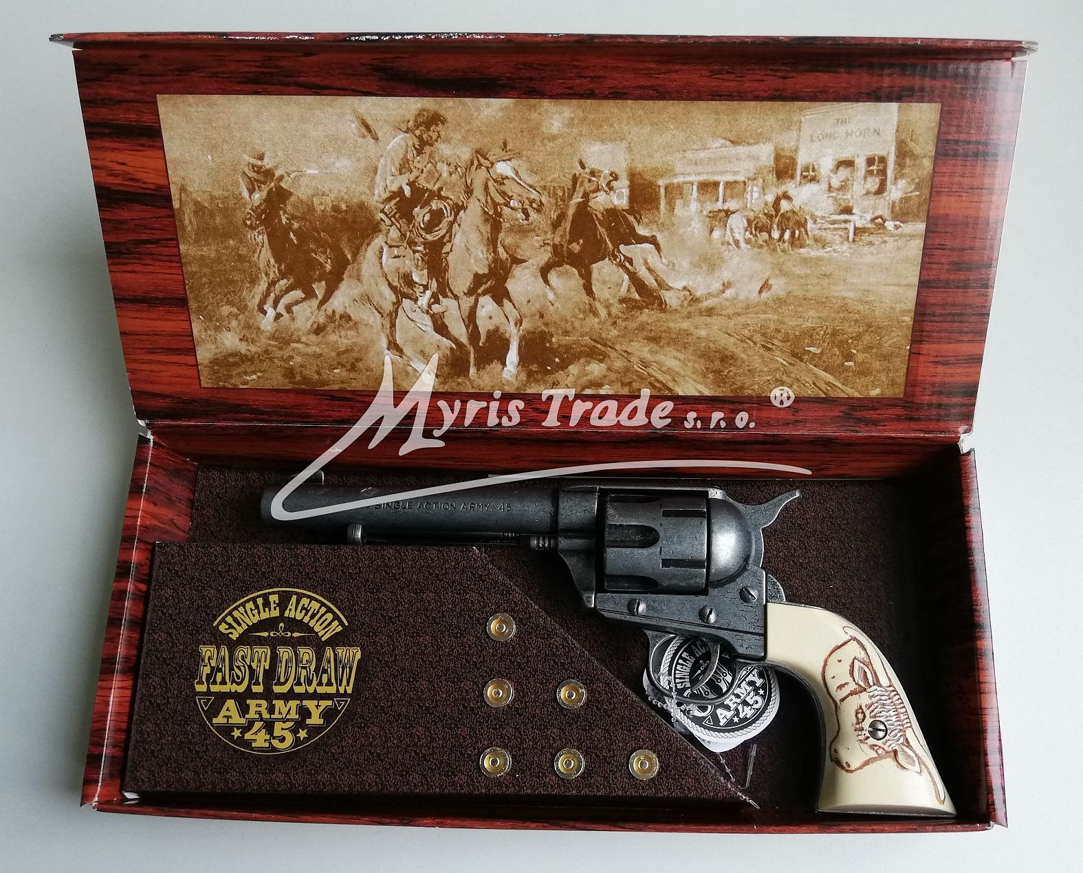 nefunkční replika revolveru ráže 45 s pažbou imitace slonové kosti s vyobrazením býka, hlaveň a bubínek v barvě šedého kovu, balená ve stylové krabici s replikami nábojů