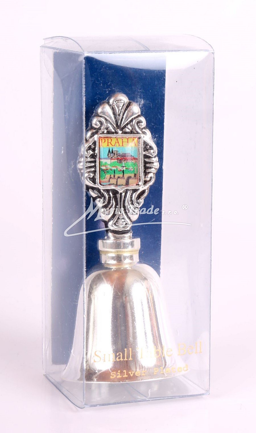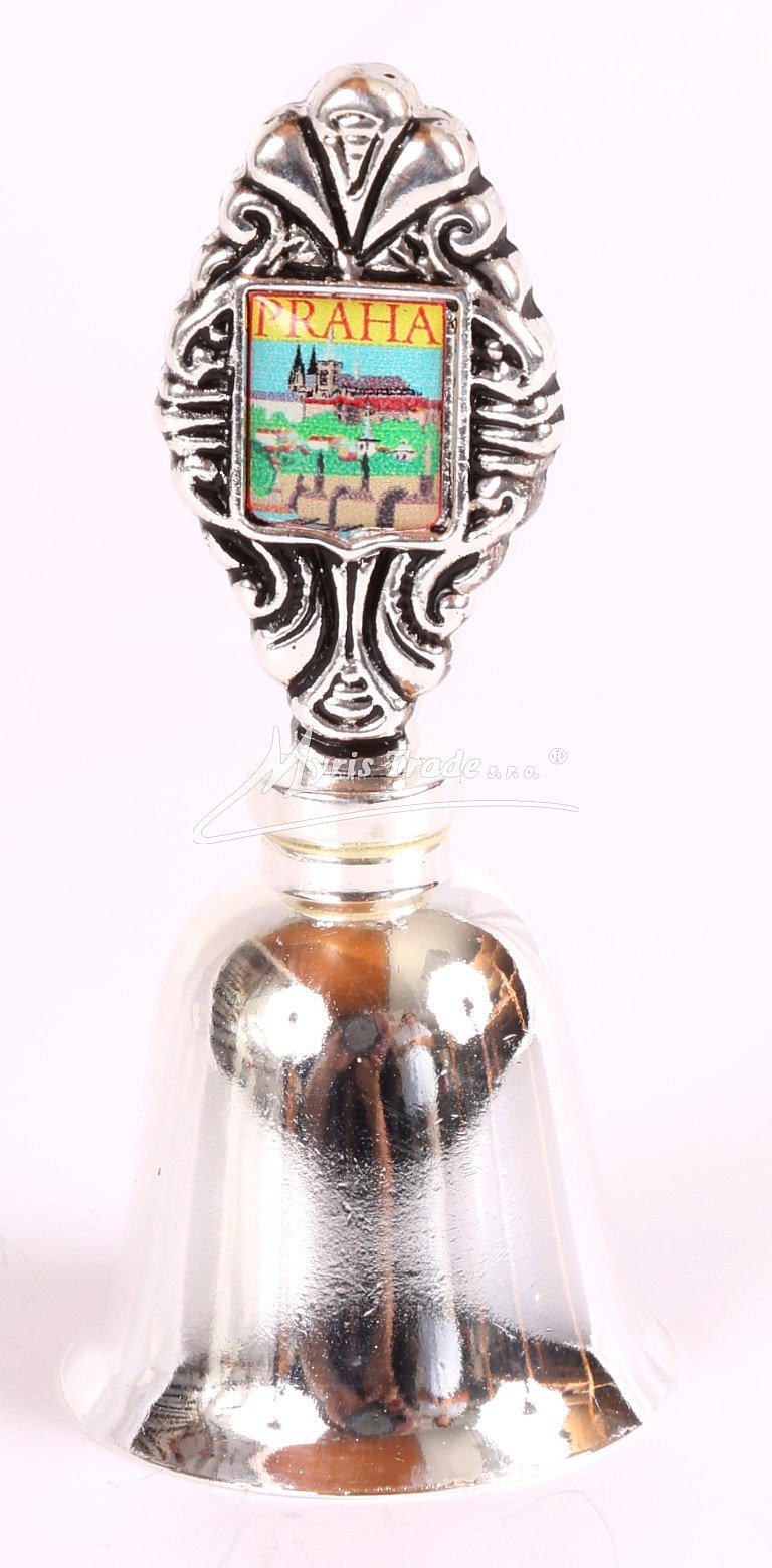 postříbřený hladký zvoneček s obrázkem Prahy v dárkové krabičce