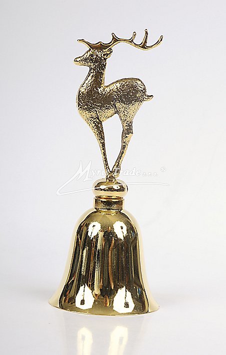 velký hladký vánoční zvoneček s figurkou soba Rudolfa, pozlacený; v dárkové krabičce