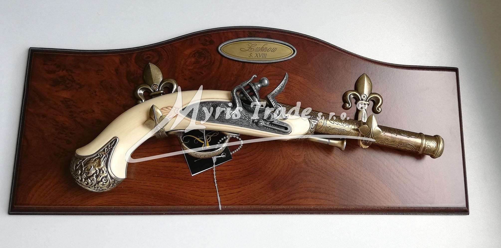 replika historické pistole z imitace slonové kosti ozdobné desce s dekorativními háčky pro zavěšení pistole v bronzové barvě
