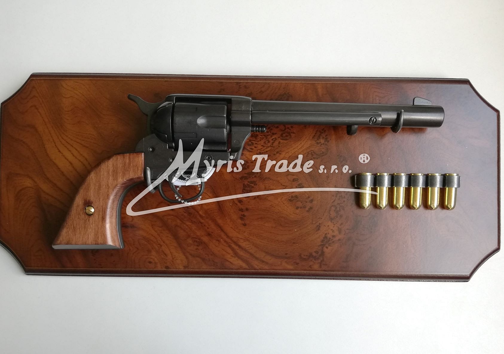 replika historického koltu s dřevěnou pažbou v černé barvě na ozdobné desce s dekorativními háčky pro zavěšení pistole a replikami nábojů