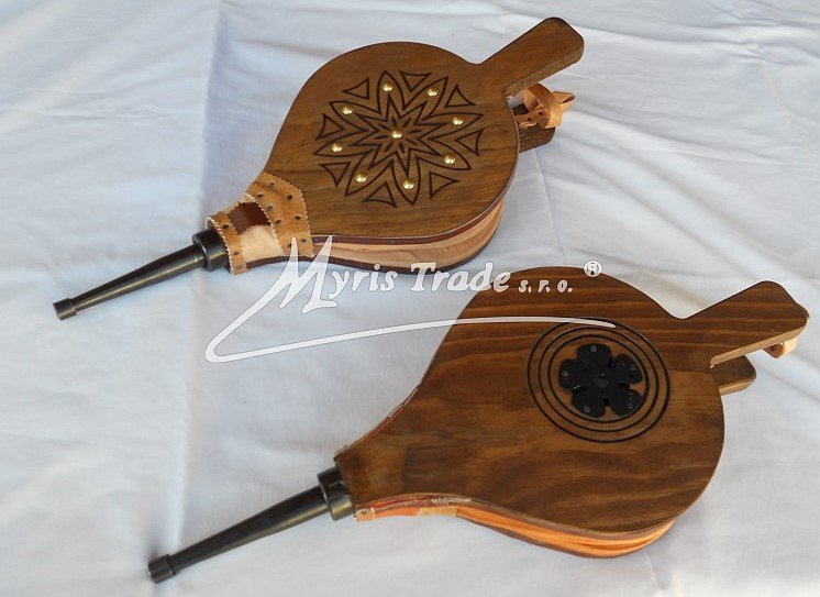 funkční krbové dmychadlo ze dřeva a z pravé kůže; zdobené vypalováním a kovovými cvočky; vhodné pro krby a domácí i venkovní grily