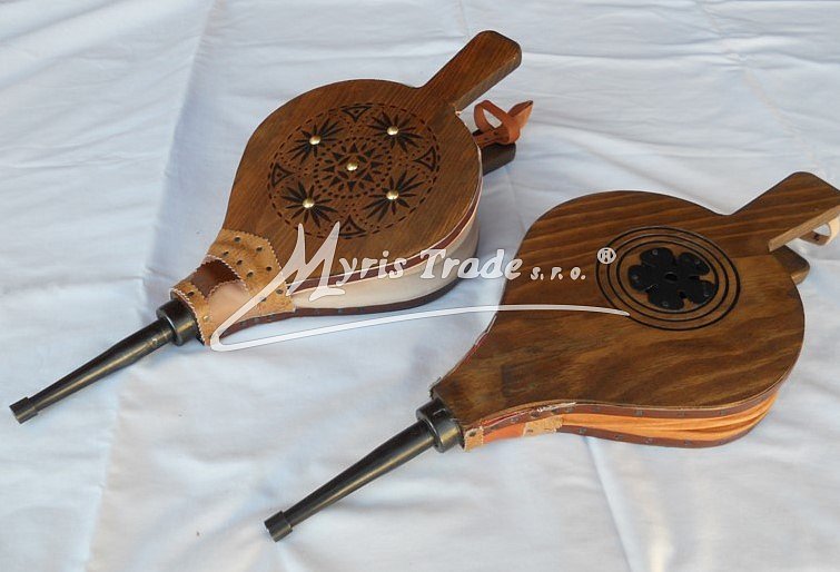 funkční krbové dmychadlo ze dřeva a z pravé kůže; zdobené vypalováním a kovovými cvočky; vhodné pro krby a domácí i venkovní grily