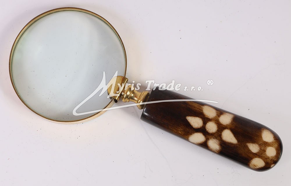 mosazná lupa s hnědou rukojetí s kytičkami ve starožitném stylu, s vysoce funkční čočkou s maximálním zvětšením