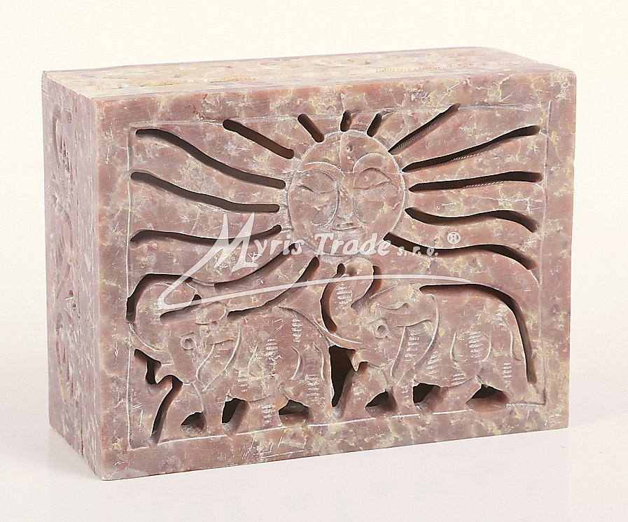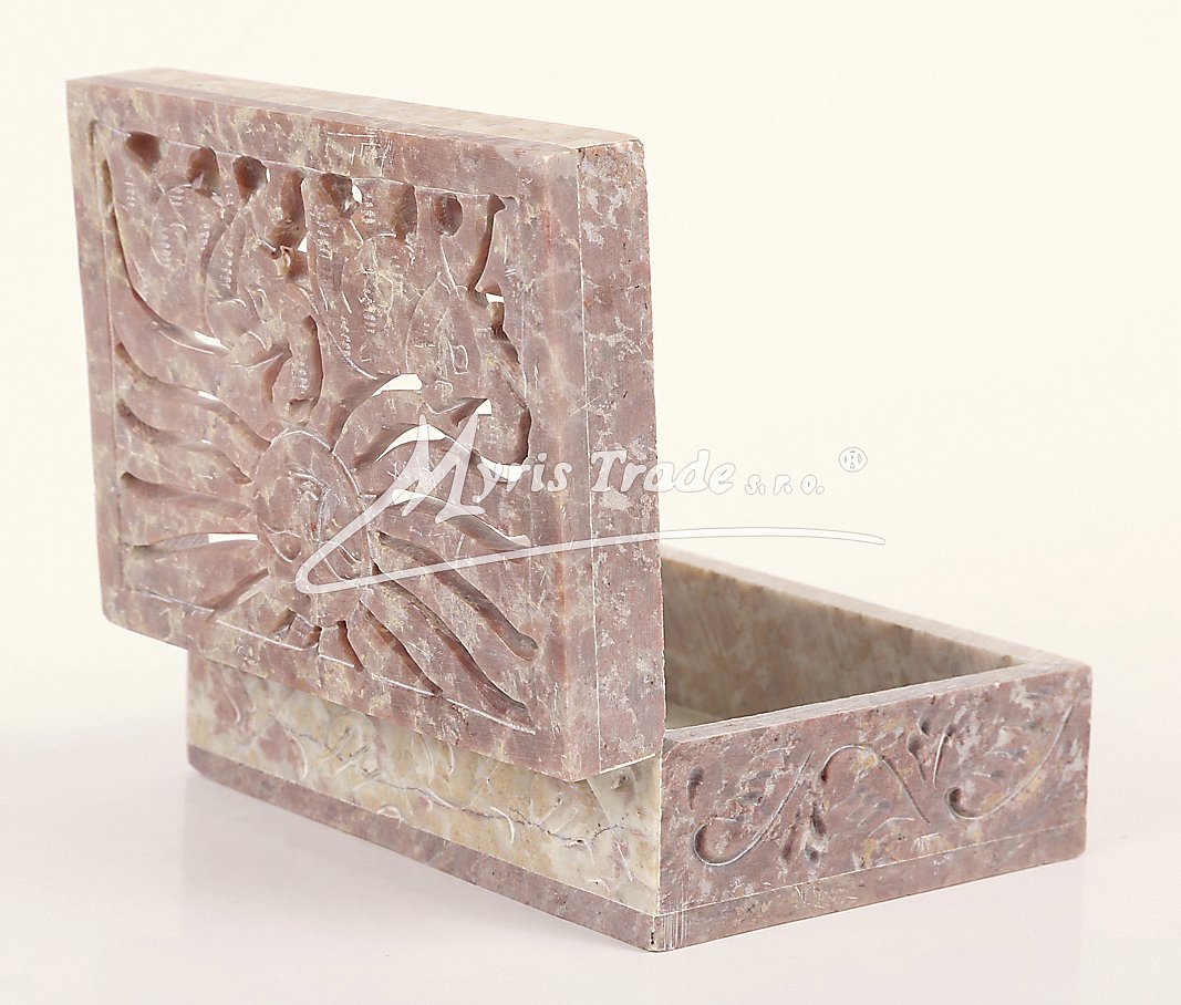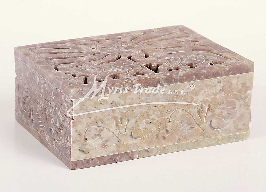 Šperkovnička z mastku s vyřezávaným víkem. Barva na obrázku je orientační. Každý kus je originální, a má svoji vlastní barvu a žíhání kamene. Žádný kus není stejný.