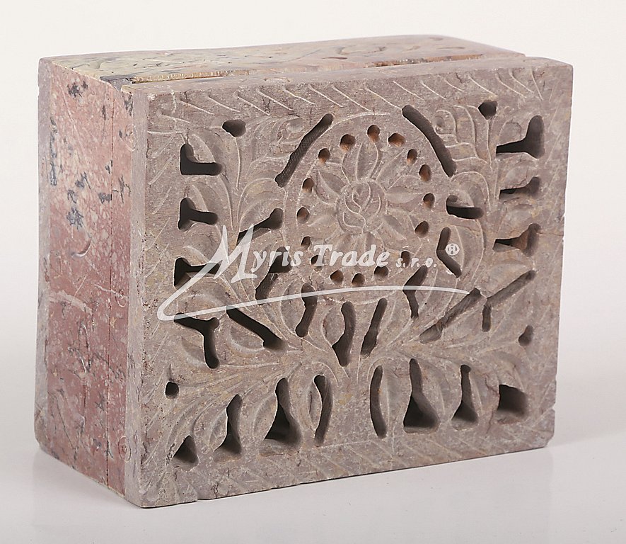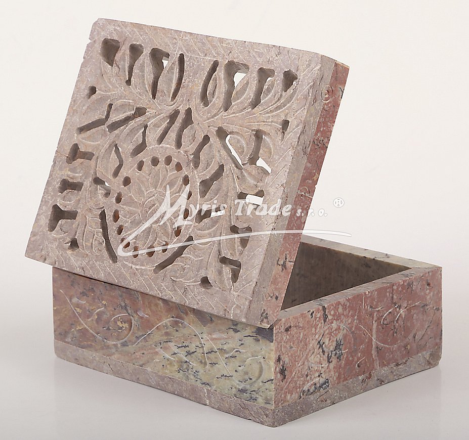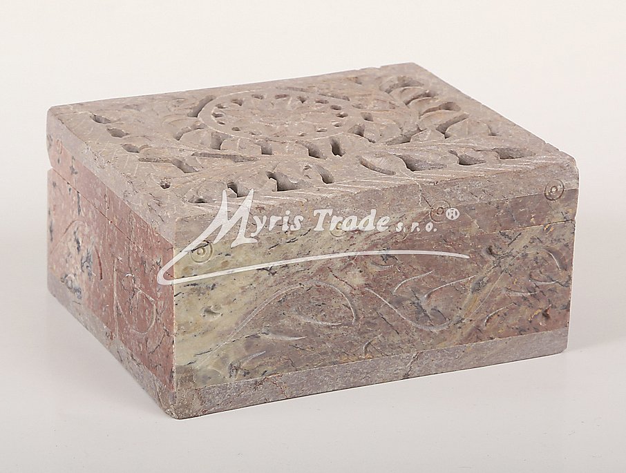 Šperkovnička z mastku s vyřezávaným víkem. Barva na obrázku je orientační. Každý kus je originální, a má svoji vlastní barvu a žíhání kamene. Žádný kus není stejný.