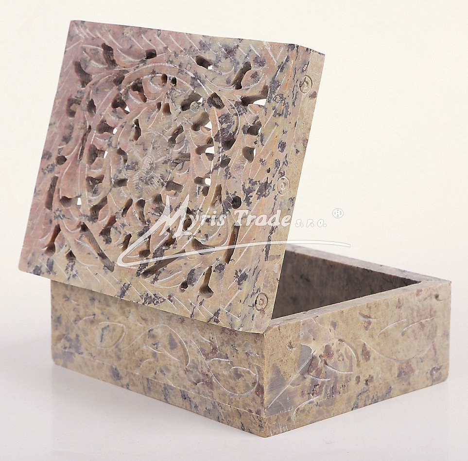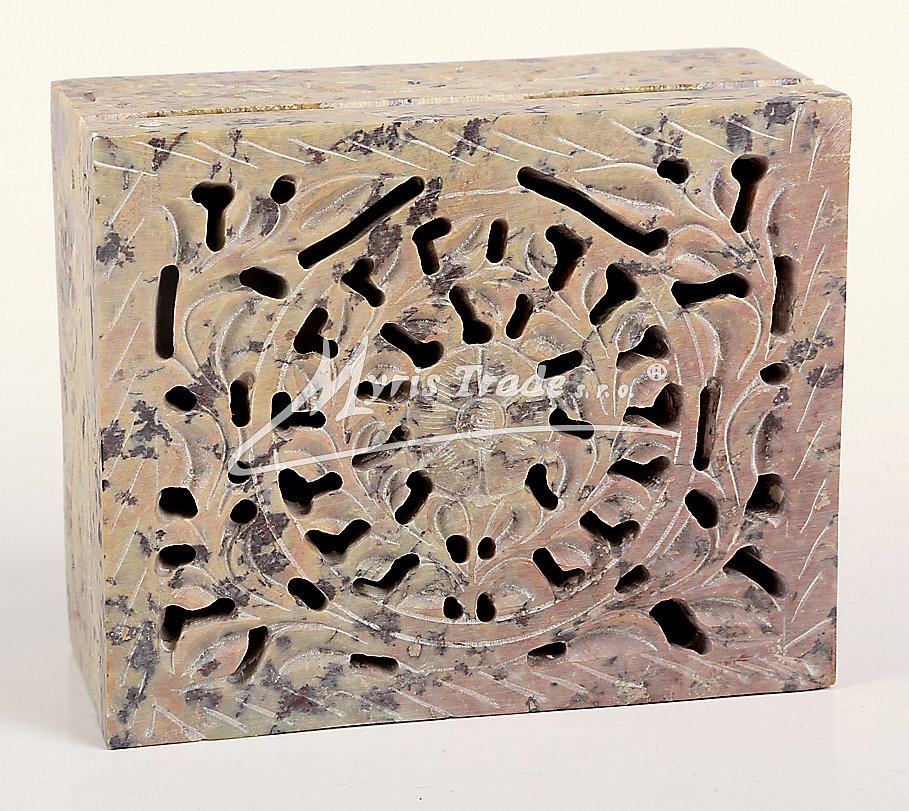 Šperkovnička z mastku s vyřezávaným víkem. Barva na obrázku je orientační. Každý kus je originální, a má svoji vlastní barvu a žíhání kamene. Žádný kus není stejný.