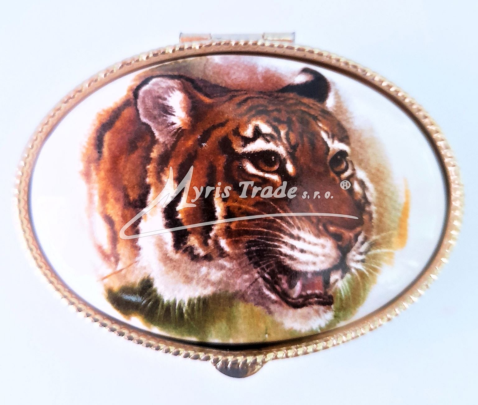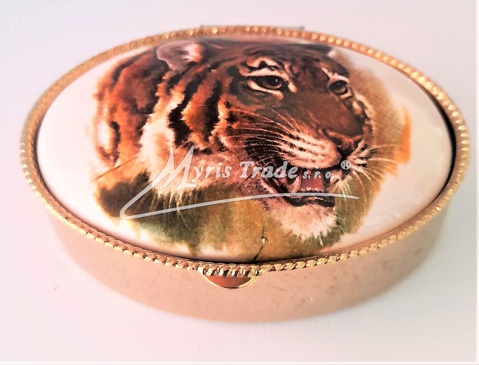 oválná lékovka je vyrobena z kovu zlaté barvy s porcelánovým víčkem s motivem hlavy tygra