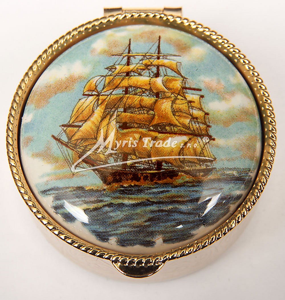 klasická kulatá lékovka je vyrobena z kovu zlaté barvy s porcelánovým víčkem s motivem historické plachetnice v různém provedení