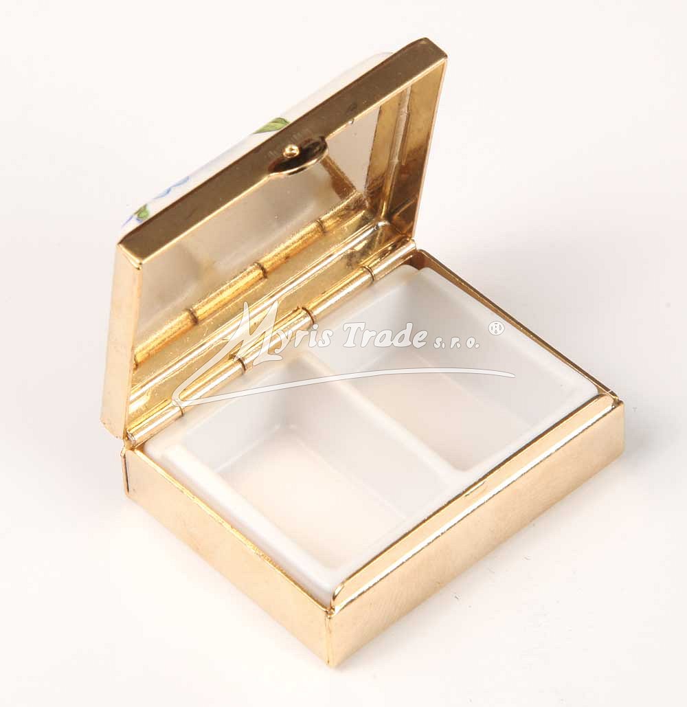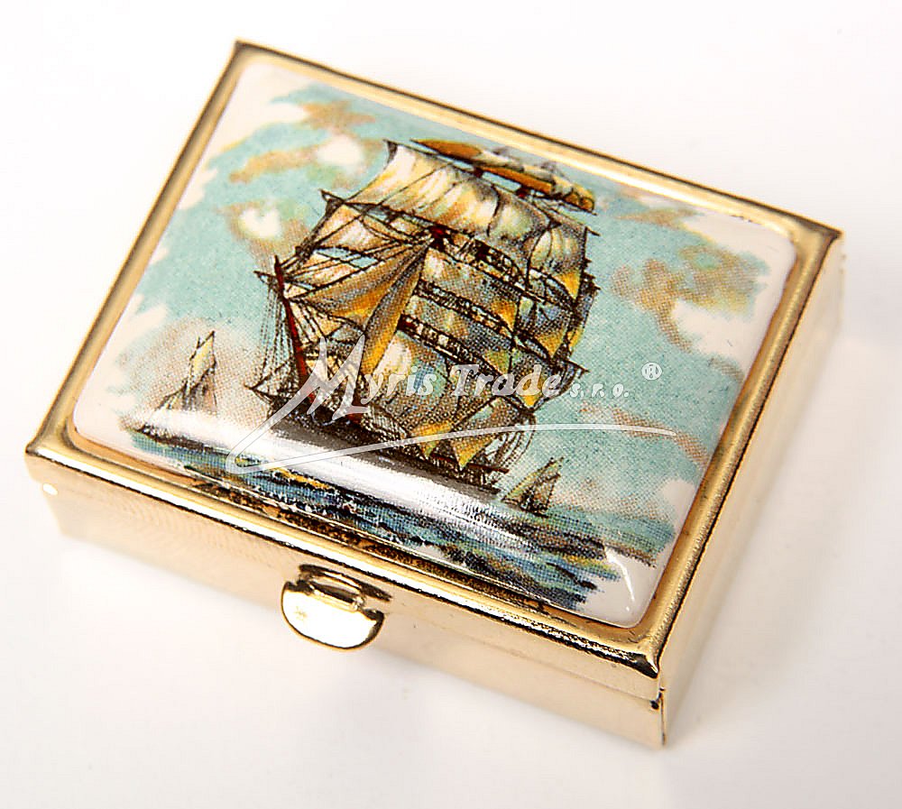 klasická obdélníková lékovka je vyrobena z kovu zlaté barvy s porcelánovým víčkem s motivem historické plachetnice v různém provedení