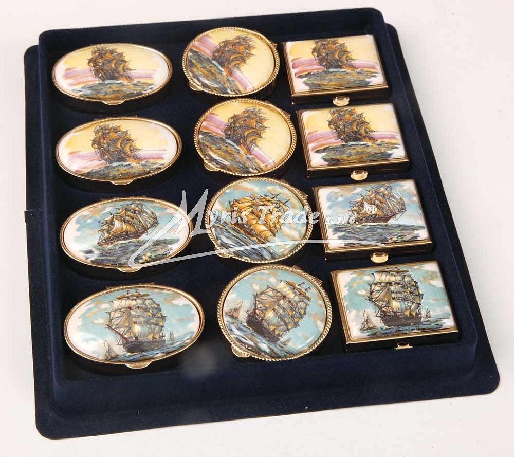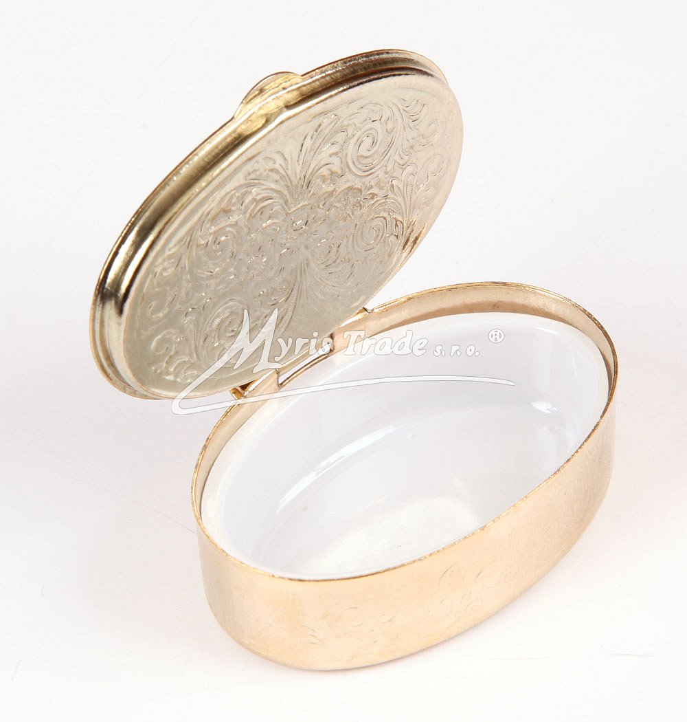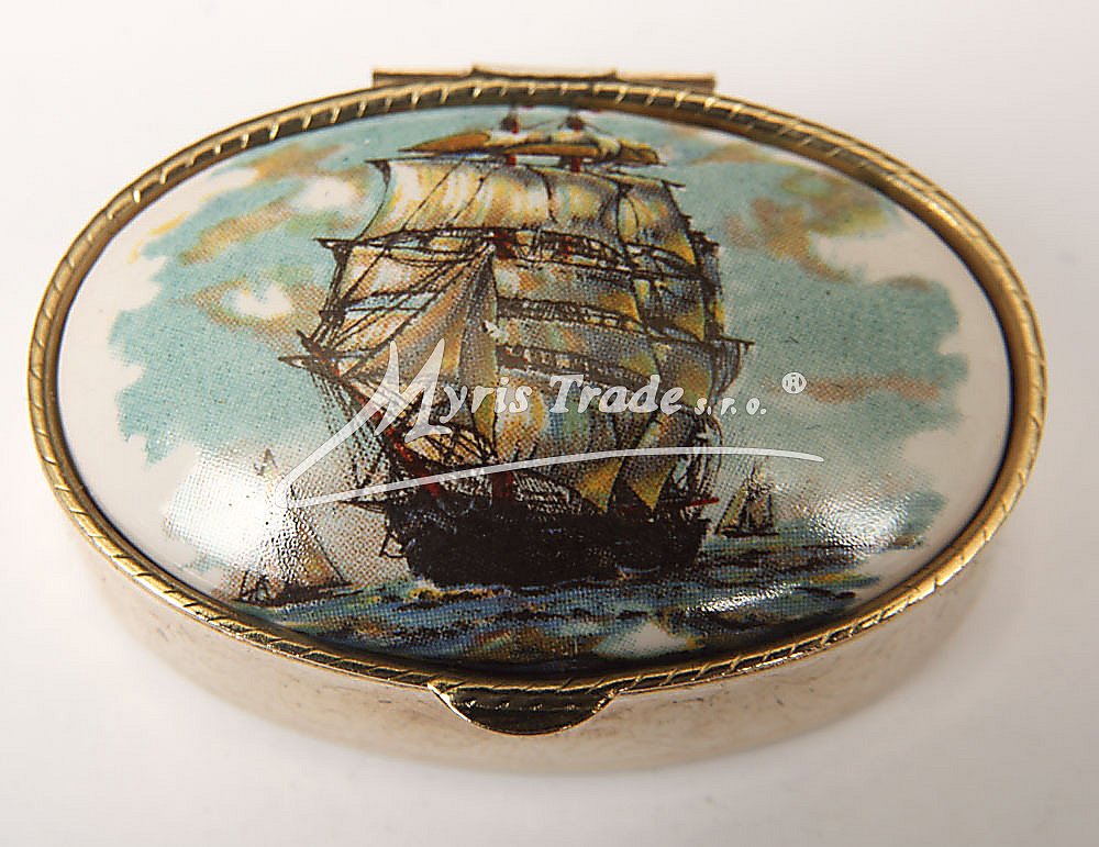 klasická oválná lékovka je vyrobena z kovu zlaté barvy s porcelánovým víčkem s motivem historické plachetnice