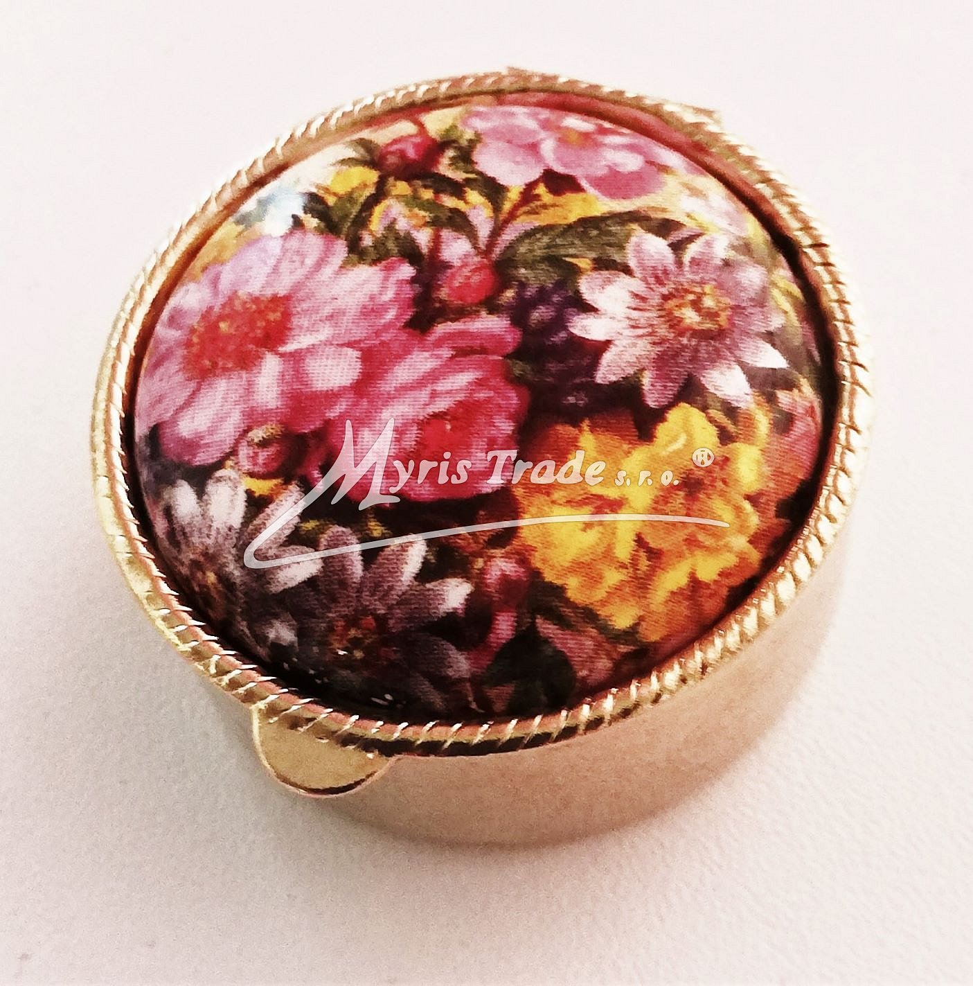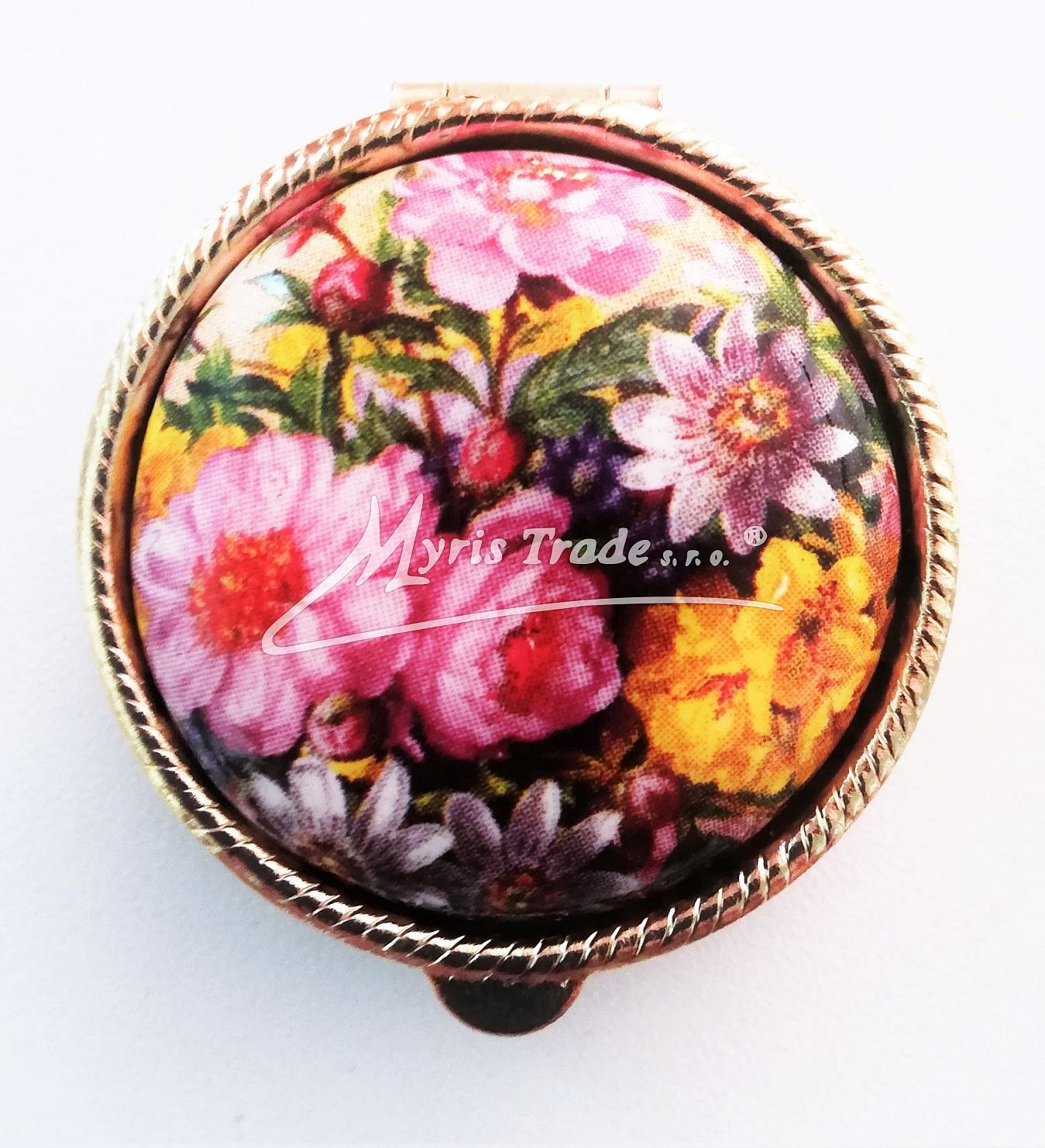 klasická kulatá lékovka je vyrobena z kovu zlaté barvy s porcelánovým víčkem s květinovým motivem