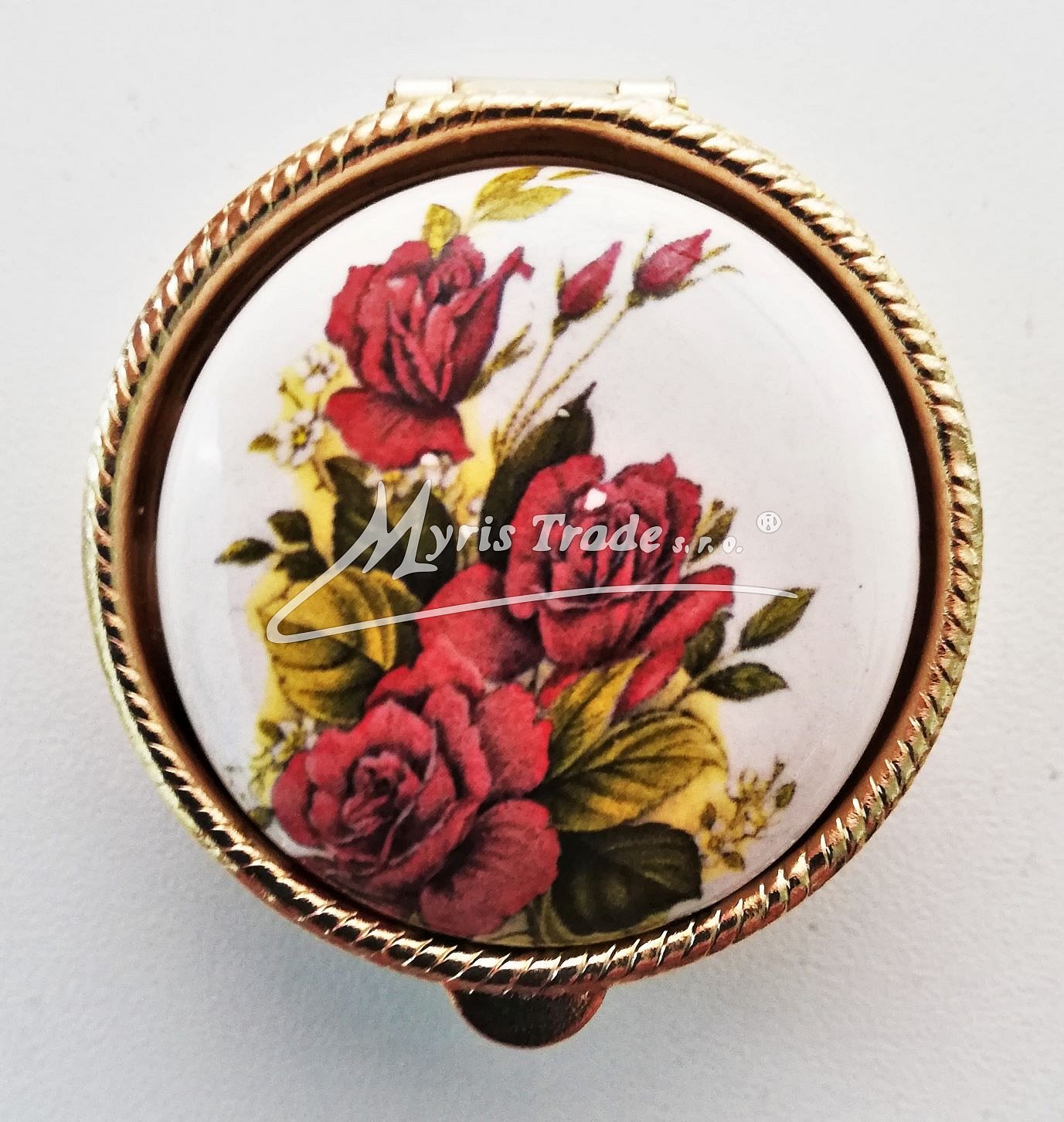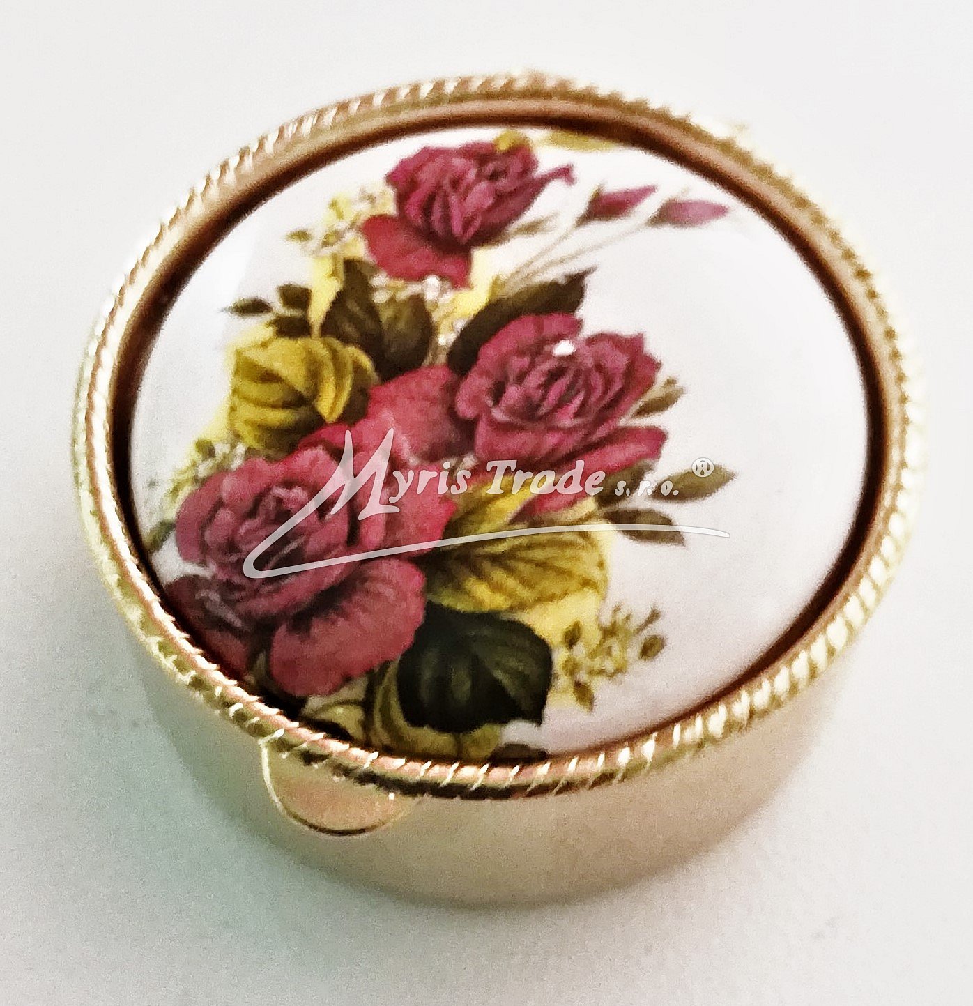 klasická kulatá lékovka je vyrobena z kovu zlaté barvy s porcelánovým víčkem s květinovým motivem