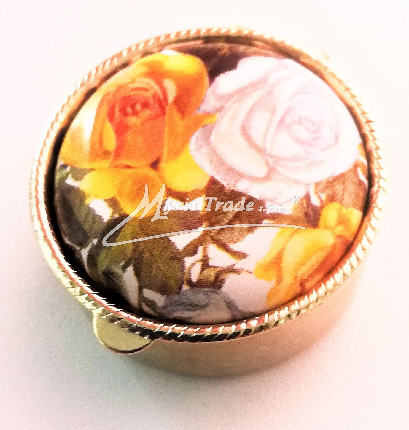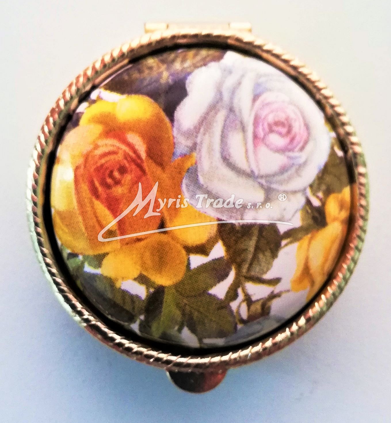 klasická kulatá lékovka je vyrobena z kovu zlaté barvy s porcelánovým víčkem s květinovým motivem