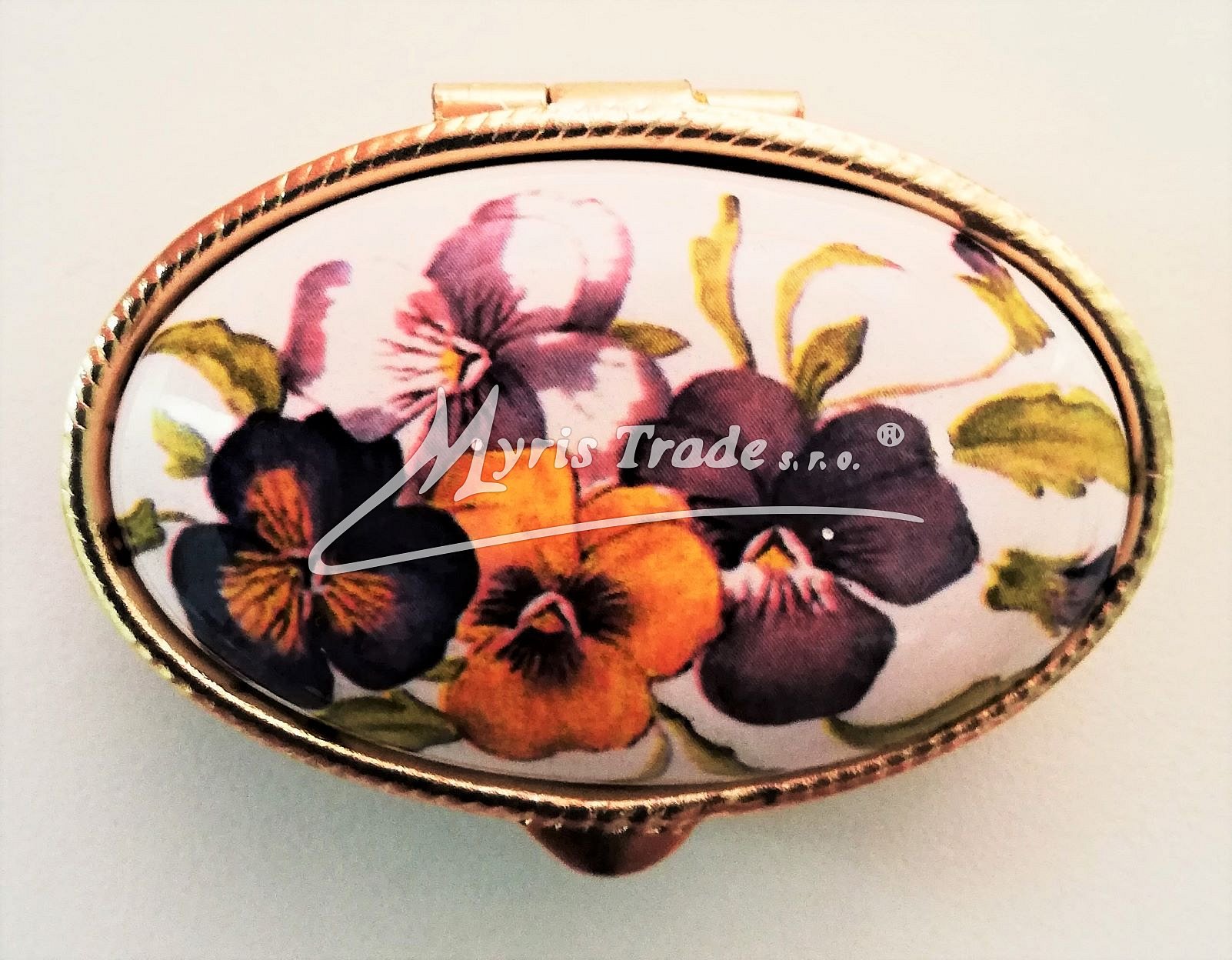 klasická oválná lékovka je vyrobena z kovu zlaté barvy s porcelánovým víčkem s květinovým motivem
