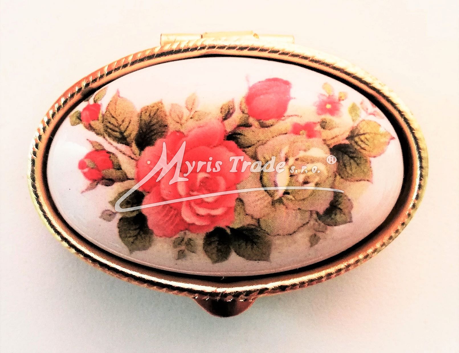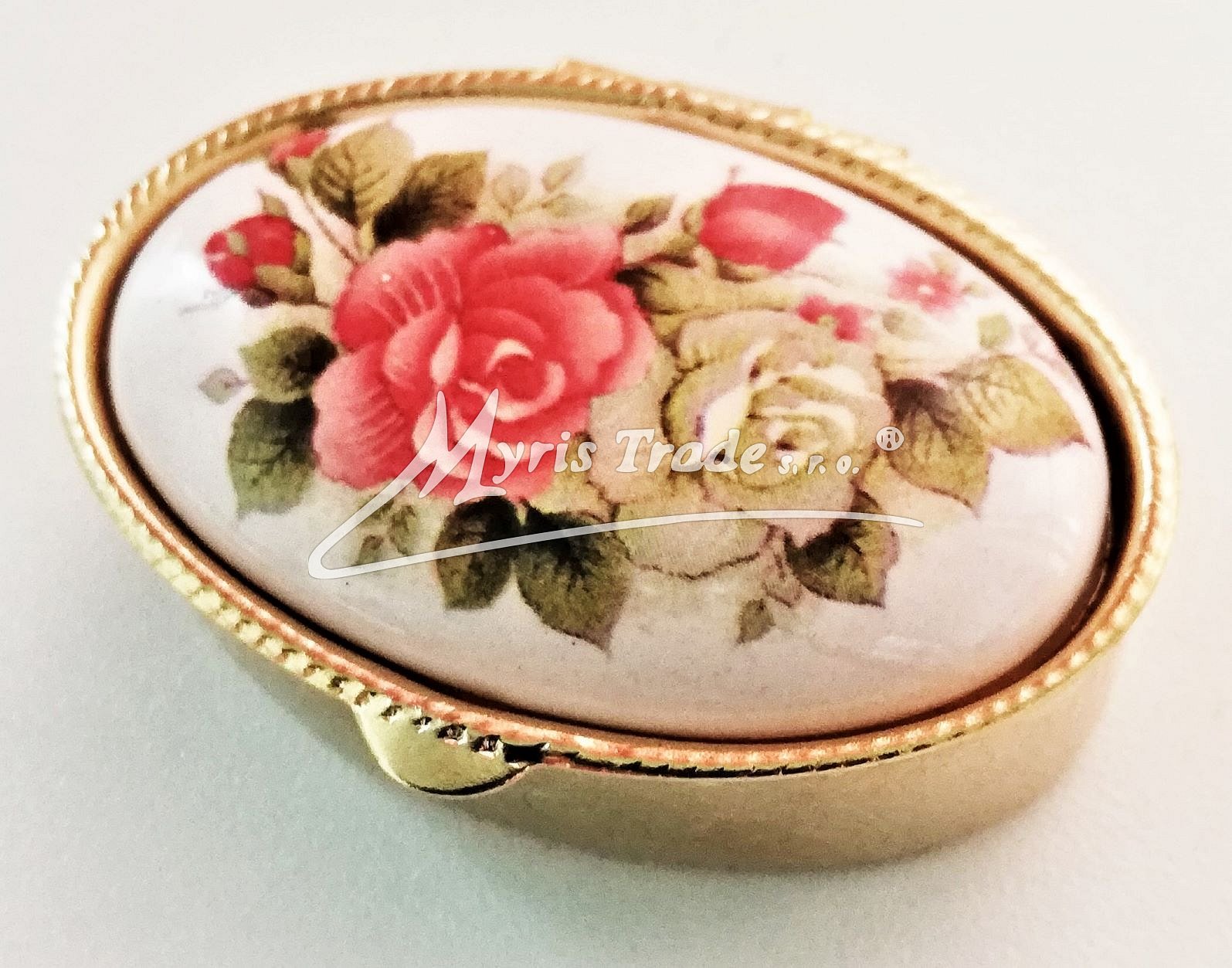 klasická oválná lékovka je vyrobena z kovu zlaté barvy s porcelánovým víčkem s květinovým motivem