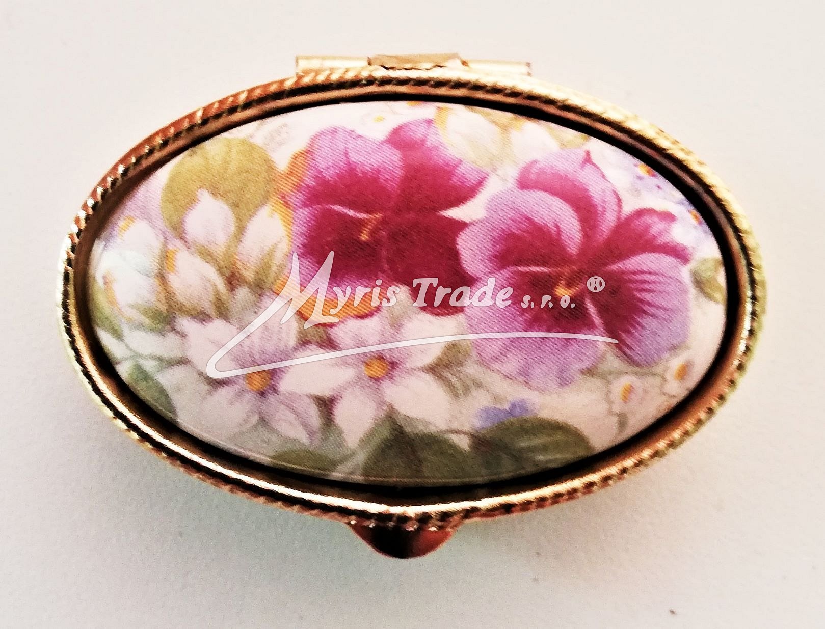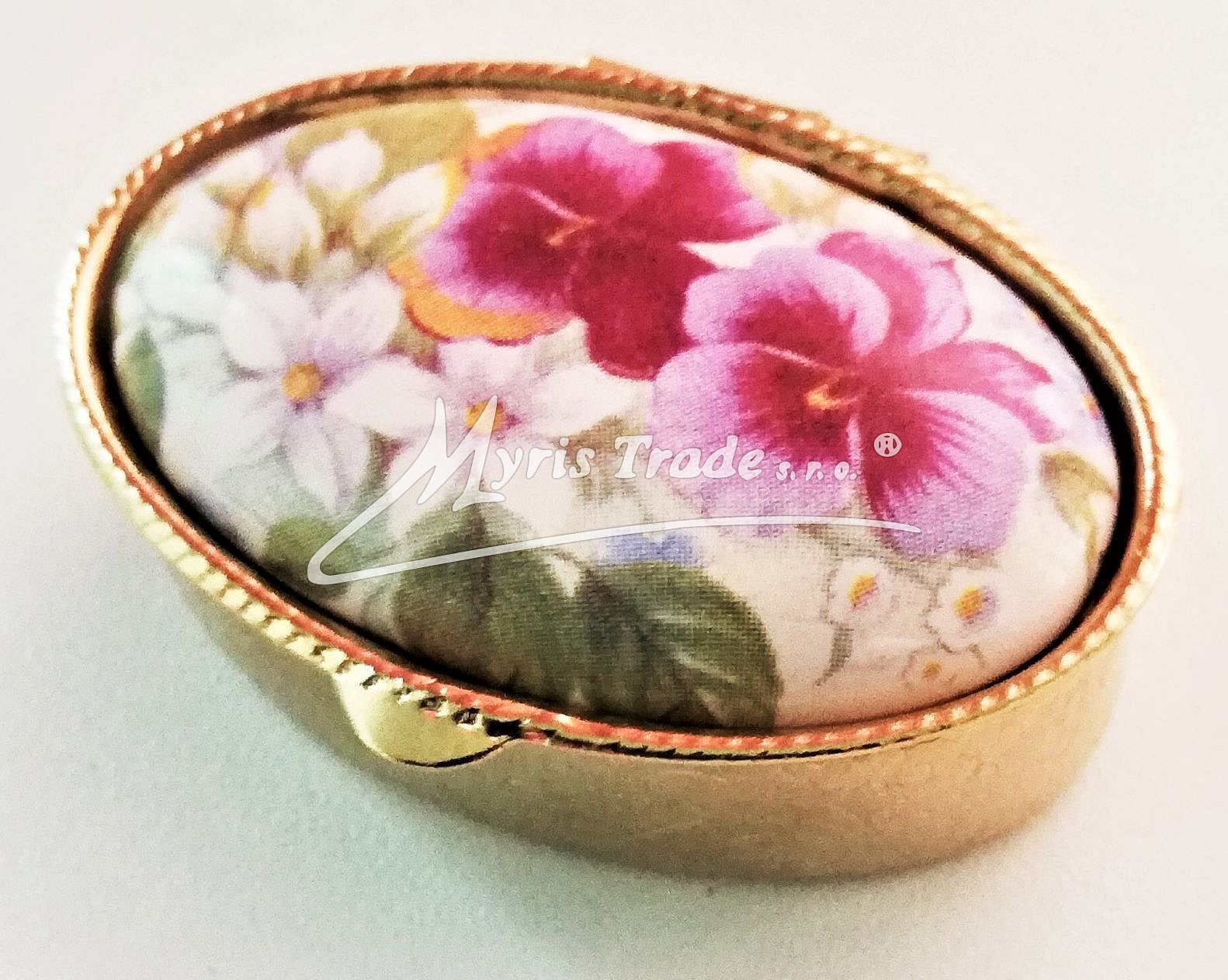 klasická oválná lékovka je vyrobena z kovu zlaté barvy s porcelánovým víčkem s květinovým motivem
