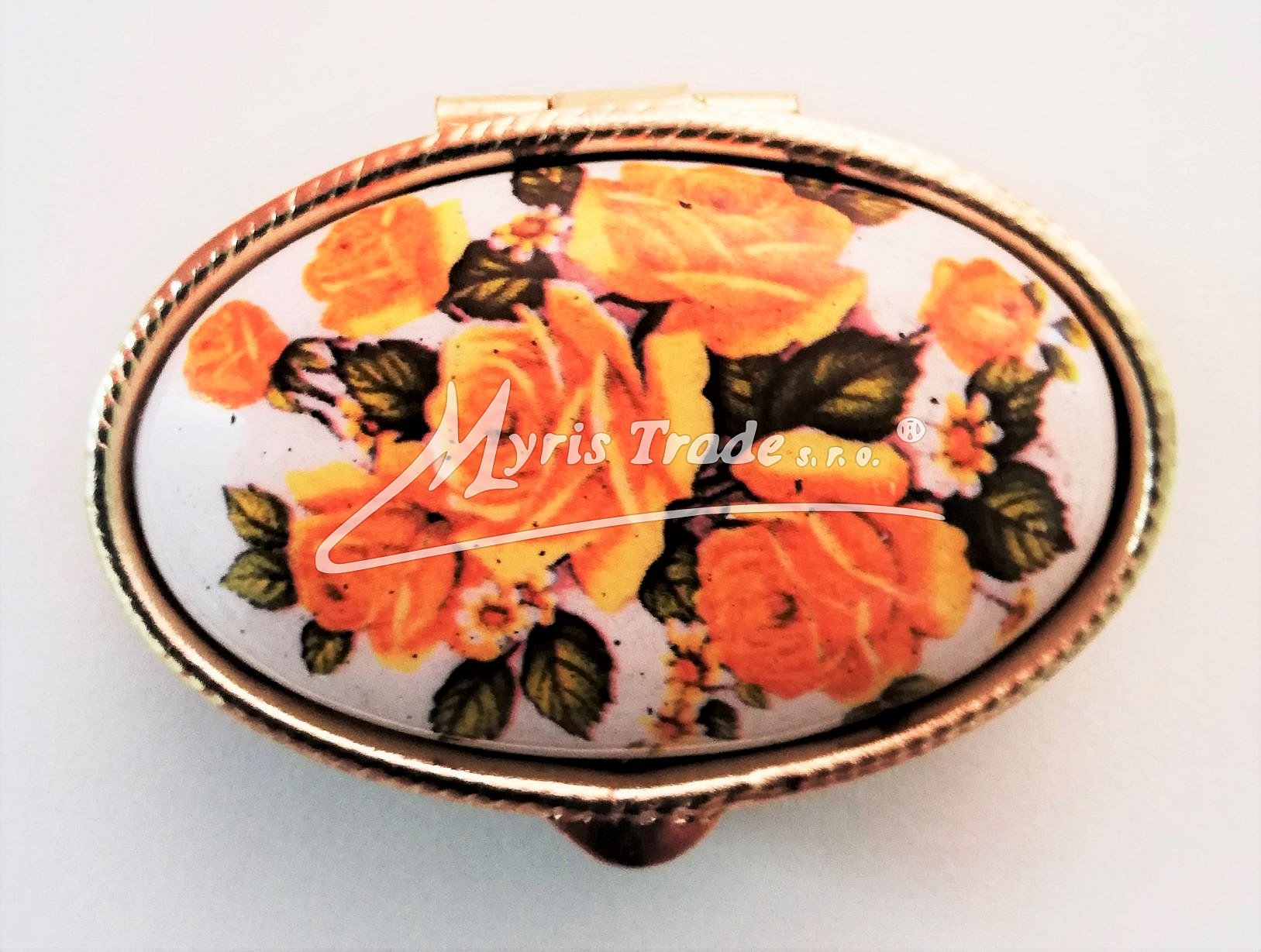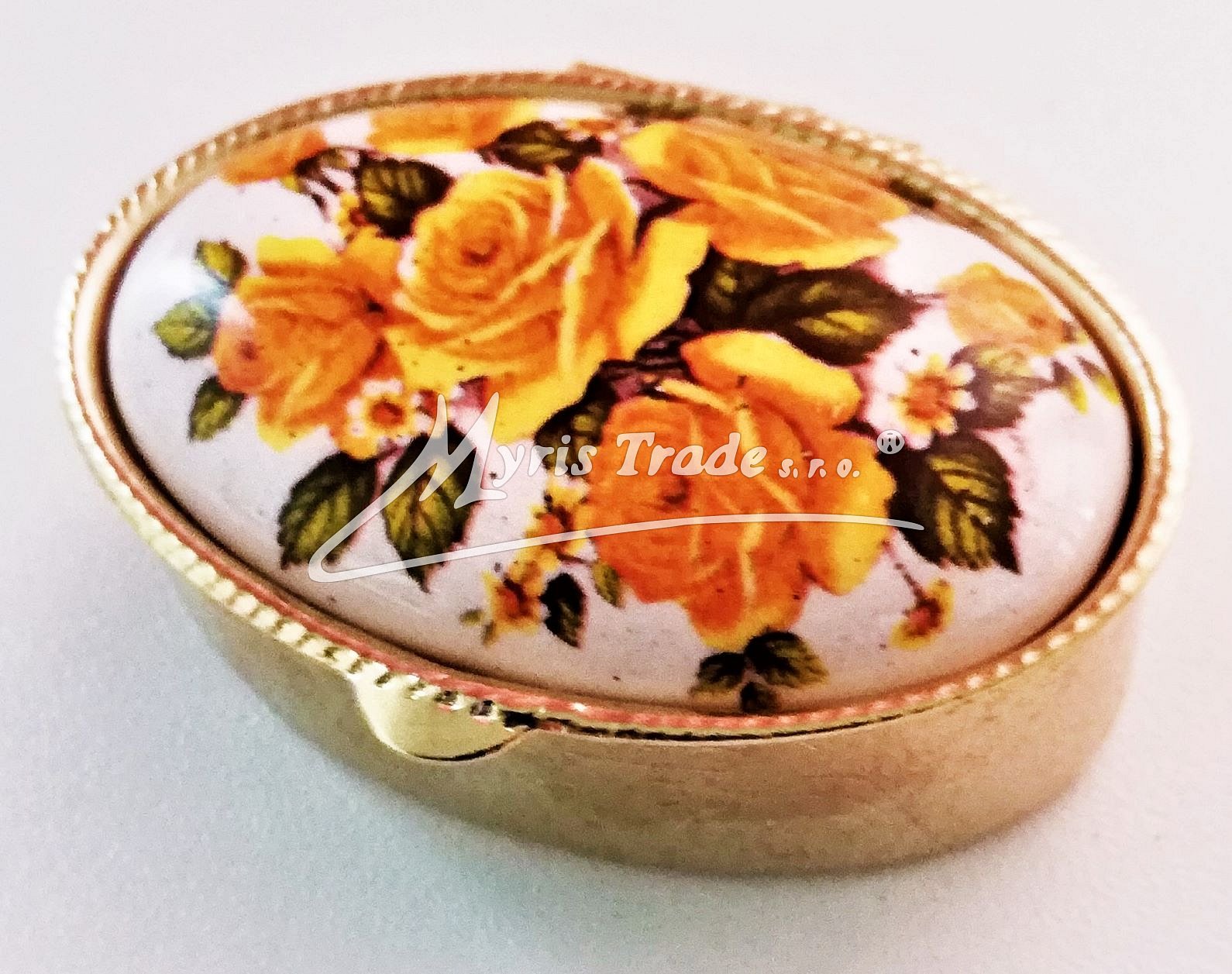 klasická oválná lékovka je vyrobena z kovu zlaté barvy s porcelánovým víčkem s květinovým motivem