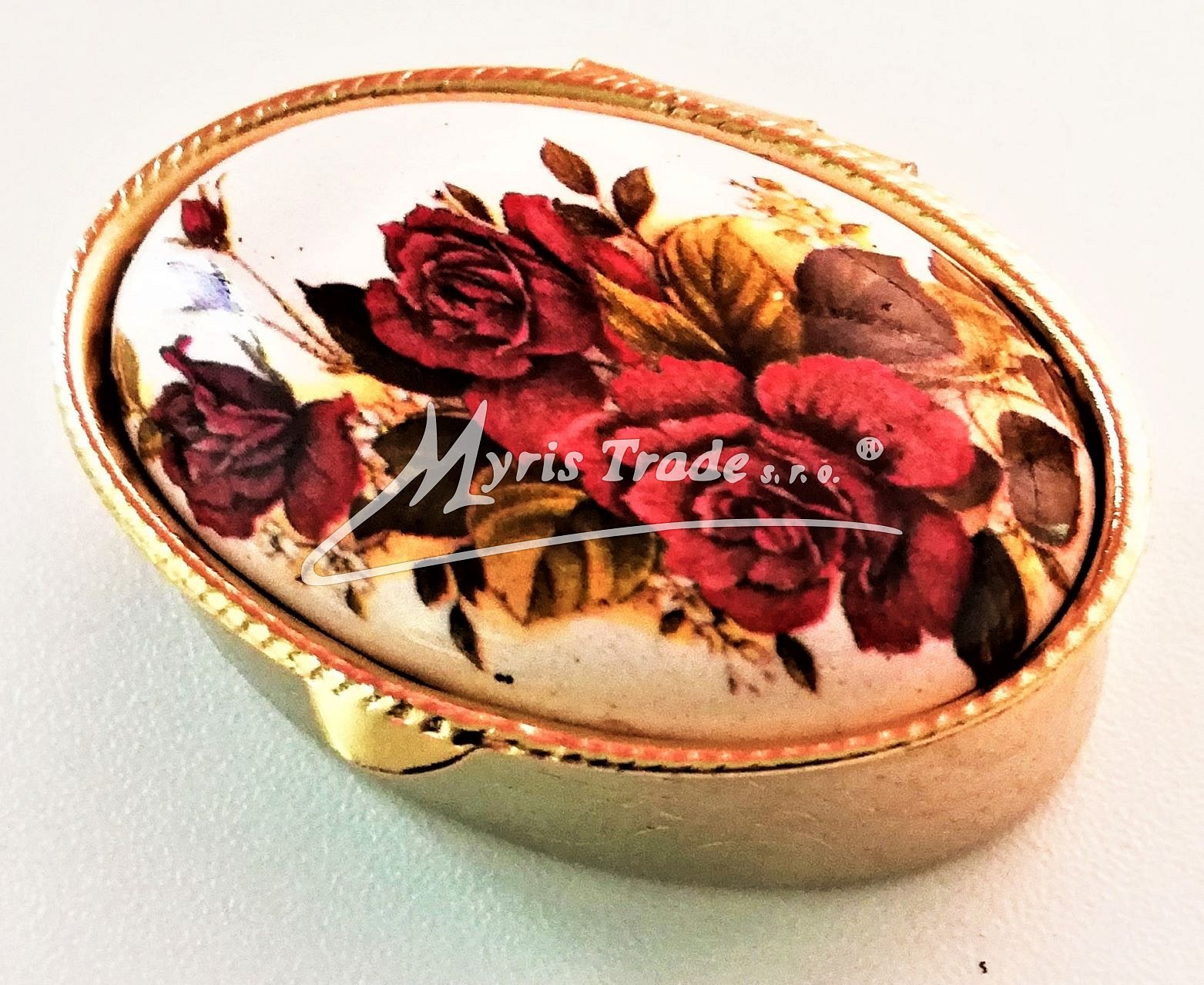 klasická oválná lékovka je vyrobena z kovu zlaté barvy s porcelánovým víčkem s květinovým motivem