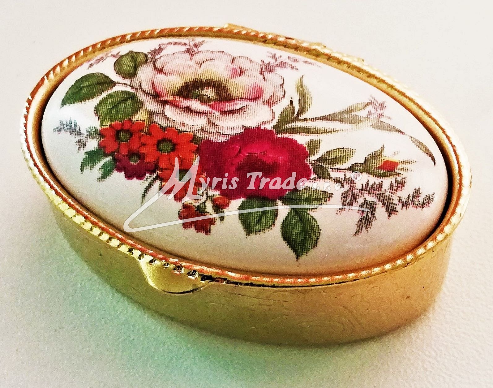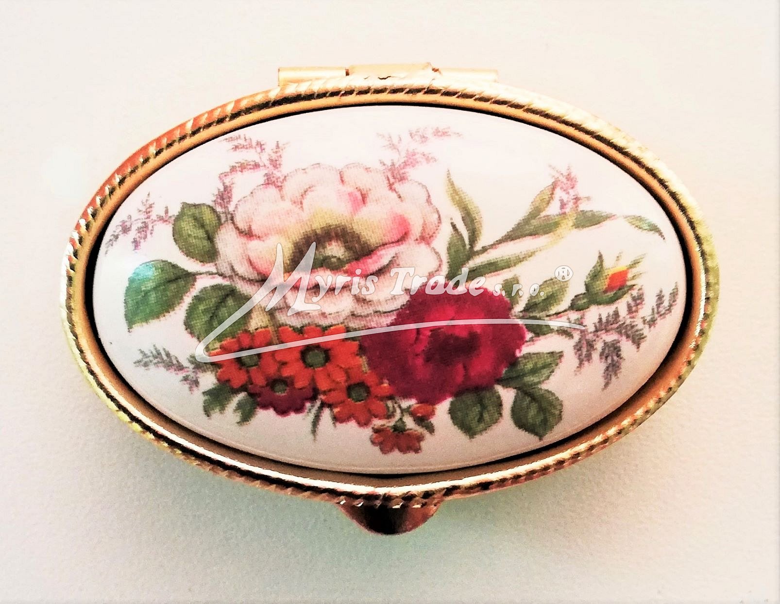 klasická oválná lékovka je vyrobena z kovu zlaté barvy s porcelánovým víčkem s květinovým motivem