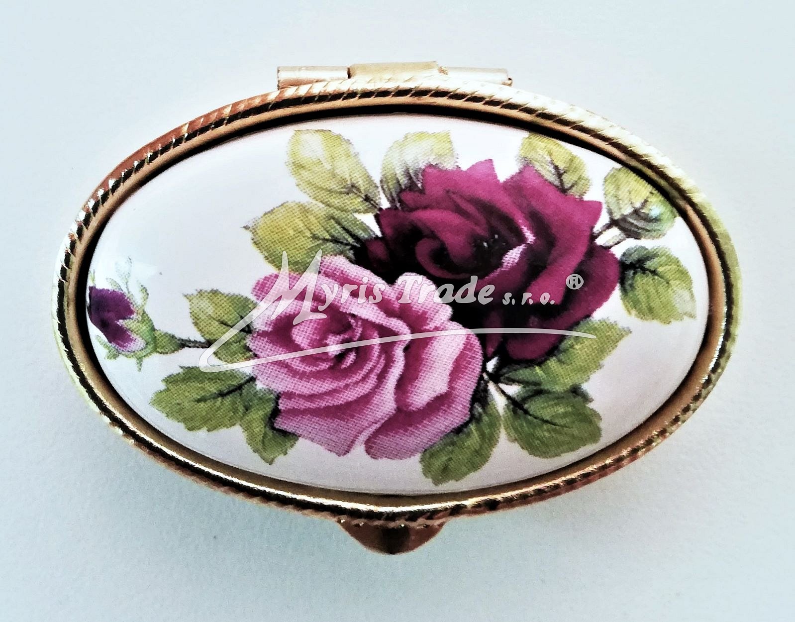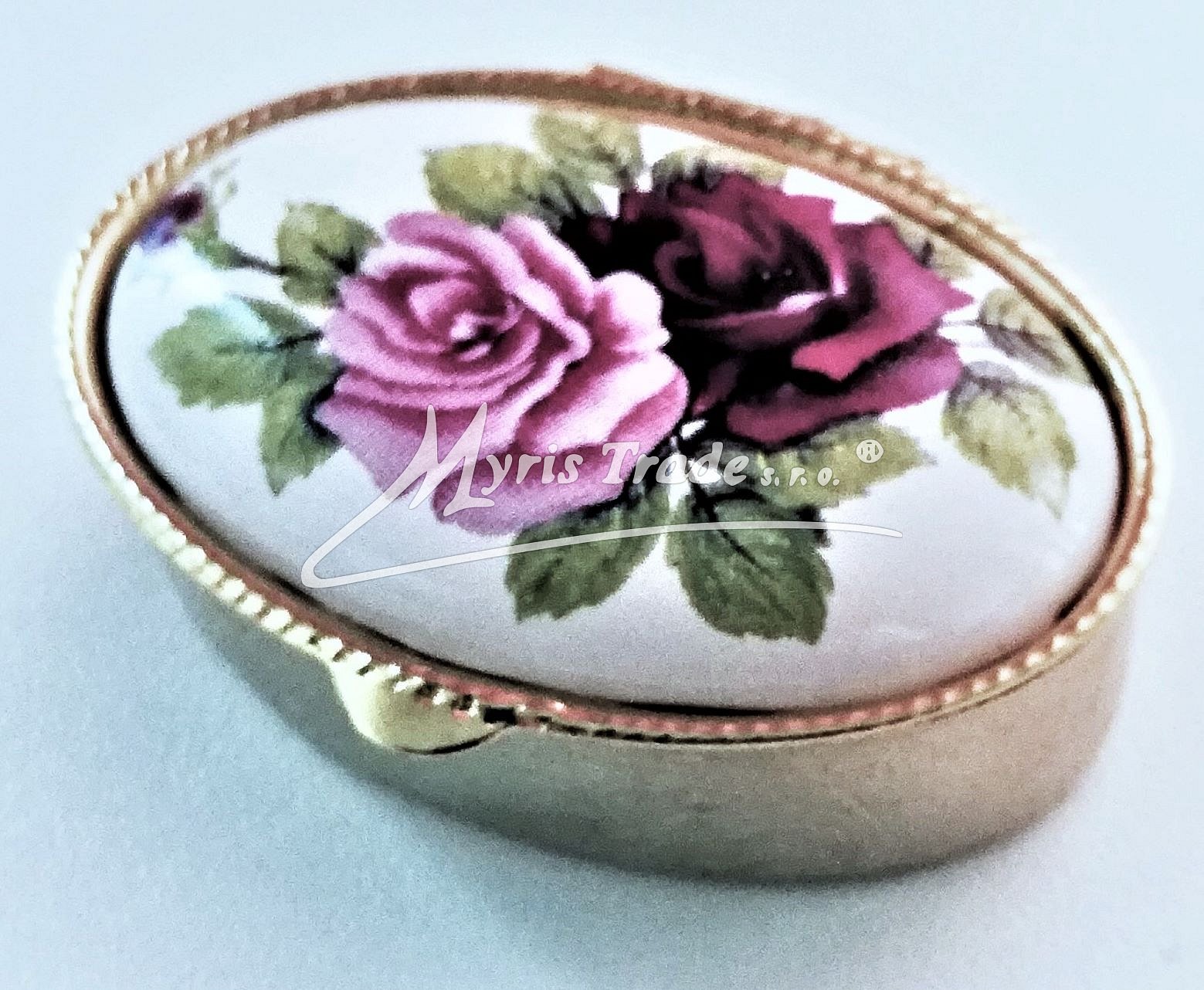 klasická oválná lékovka je vyrobena z kovu zlaté barvy s porcelánovým víčkem s květinovým motivem