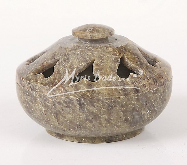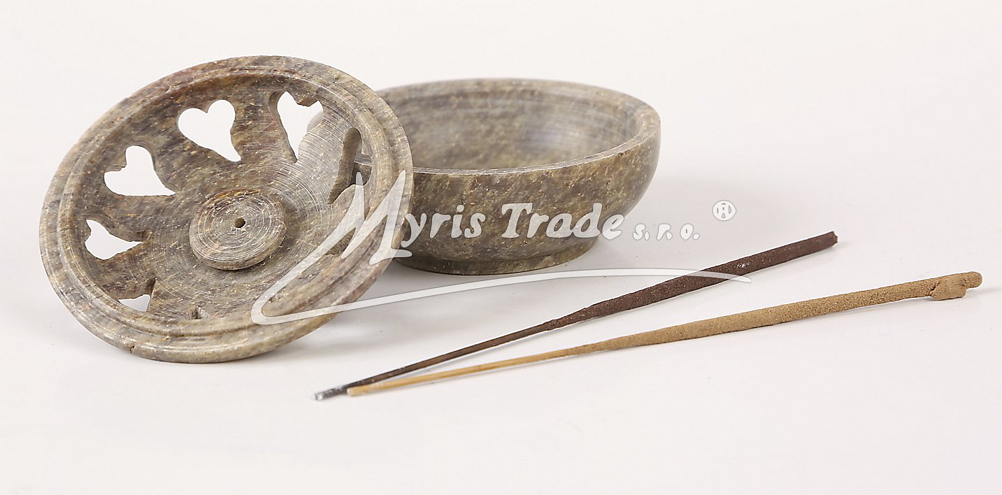 víceúčelovou, dekorativní, vyřezávanou dózičku z kamene (mastku) lze použít nejen jako ozdobnou šperkovničku, ale po obrácení víčka jako stojánek na vonné tyčinky, nebo františky - viz obrázek níže;