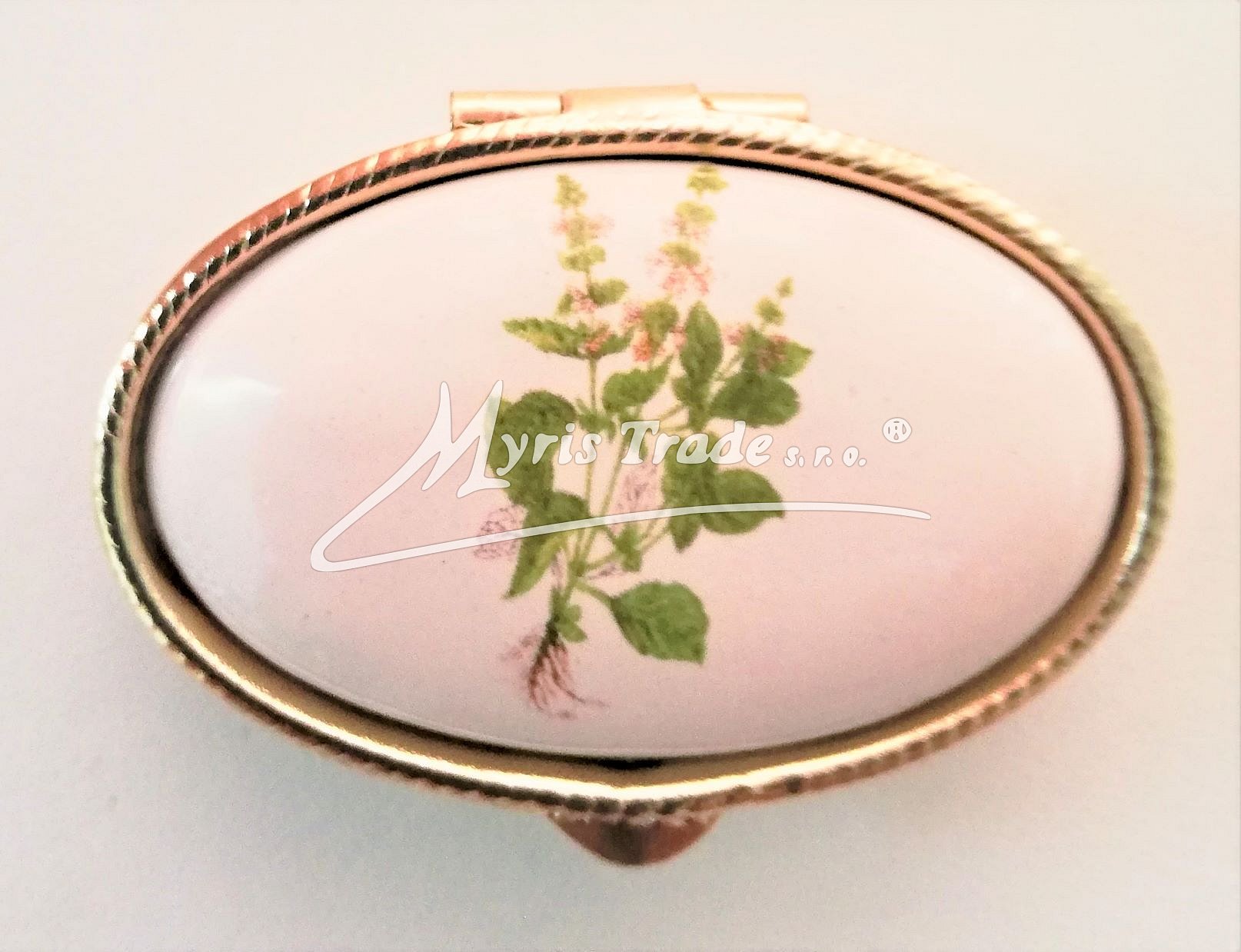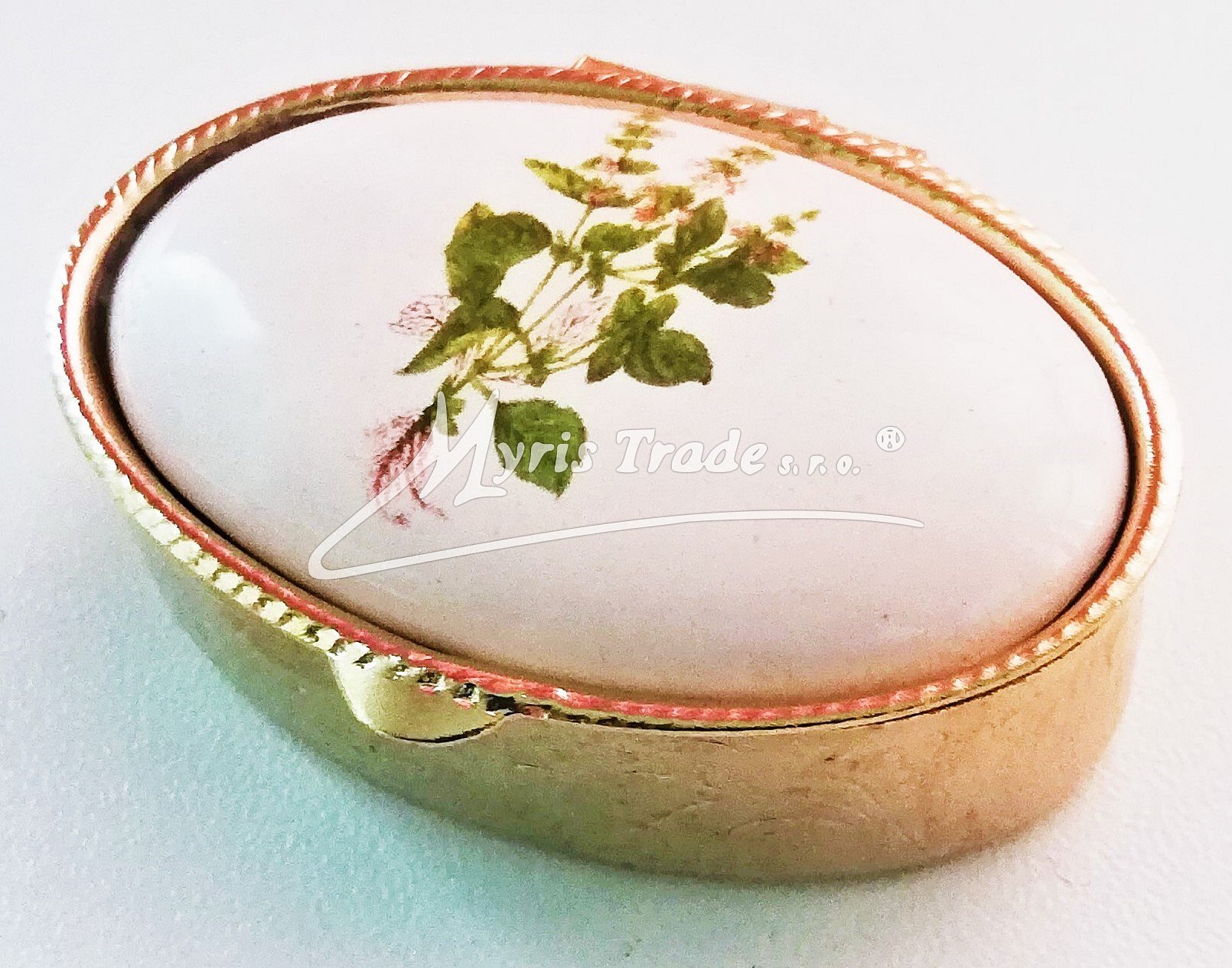 klasická oválná lékovka je vyrobena z kovu zlaté barvy s porcelánovým víčkem s květinovým motivem