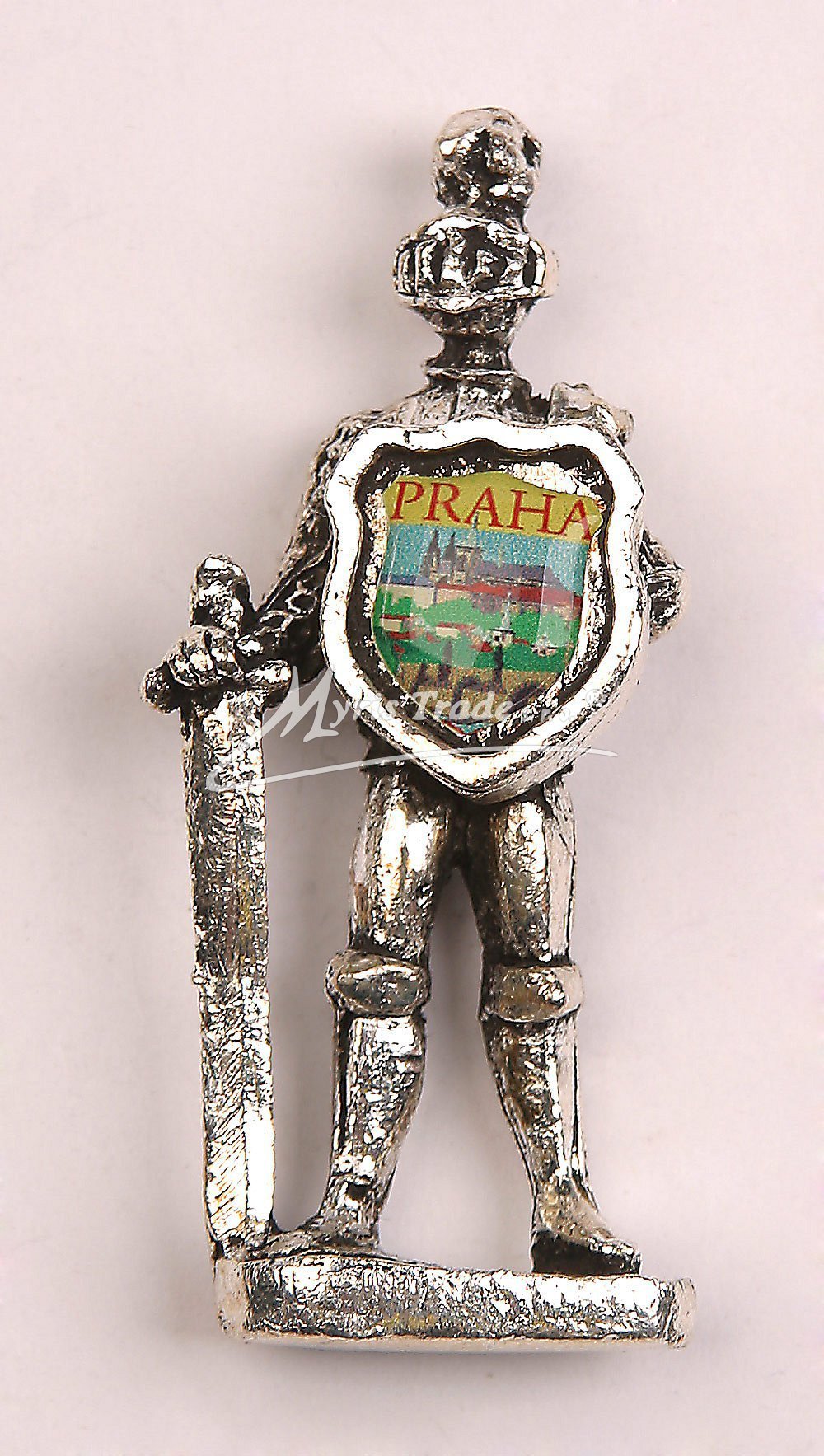 postříbřený upomínkový magnetek - figurka rytíře s emblémem Prahy
