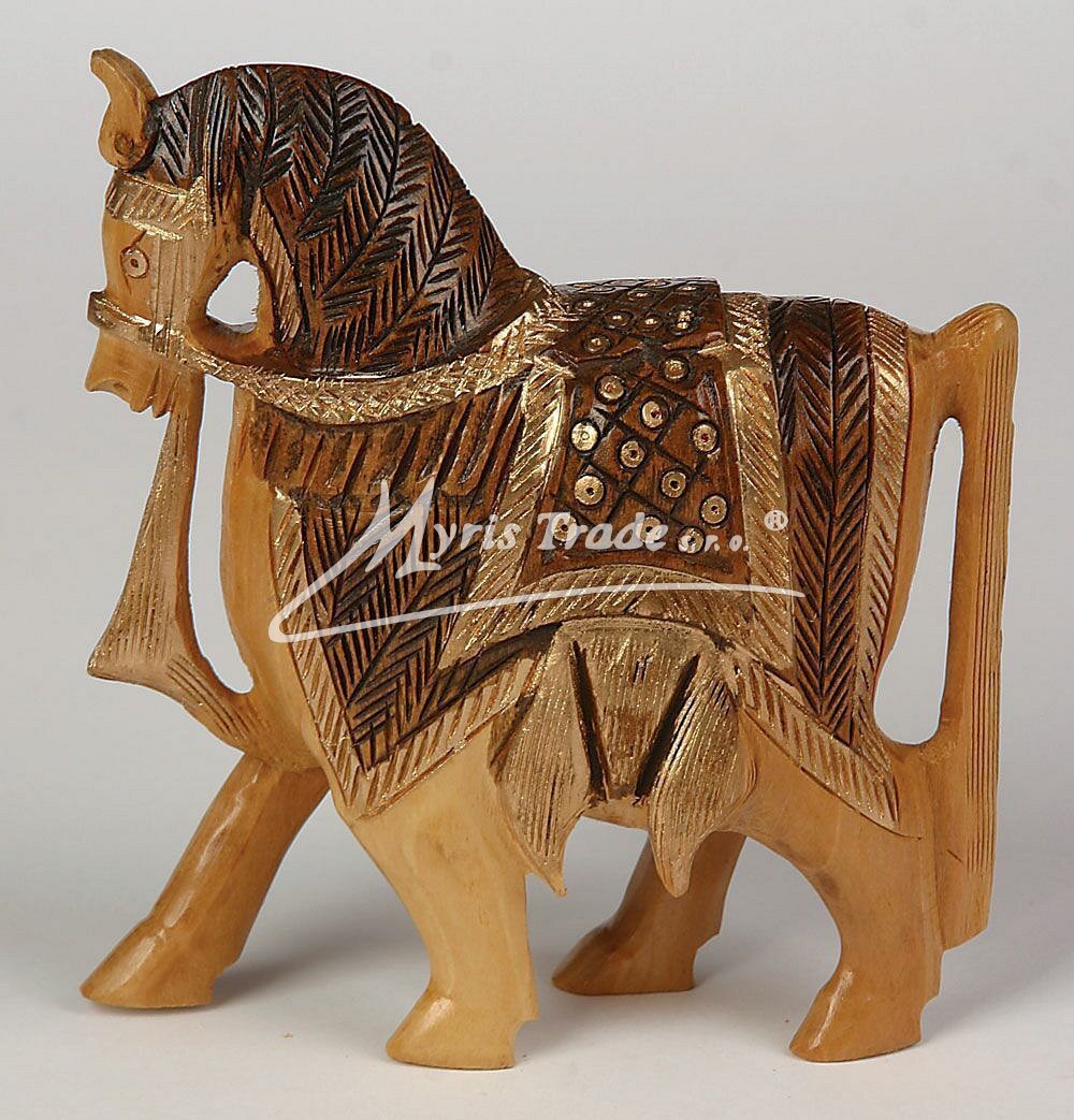 kůň dřevěný - ručně vyřezávaný, kombinace tmavého a světlého dřeva, zlacený