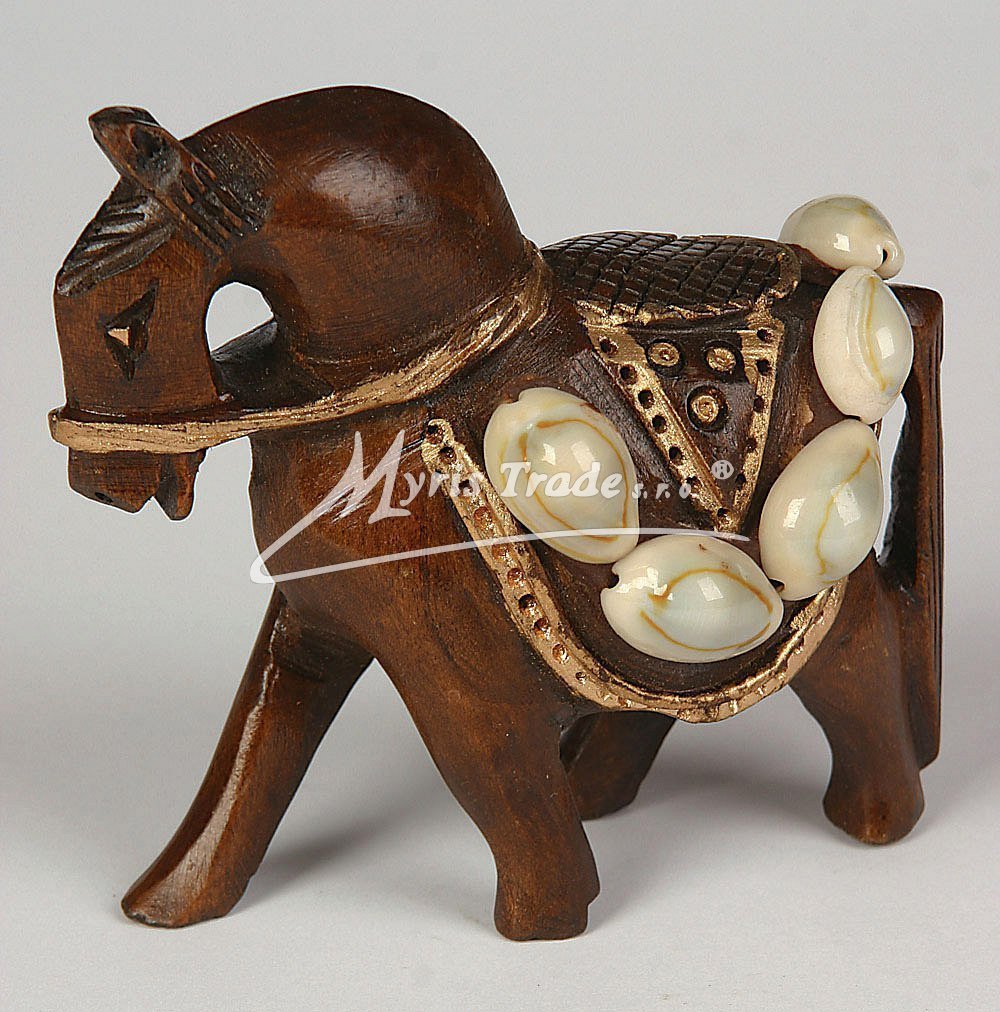 kůň dřevěný - ručně vyřezávaný, tmavé dřevo, zlacený a zdobený drobnými mušličkami