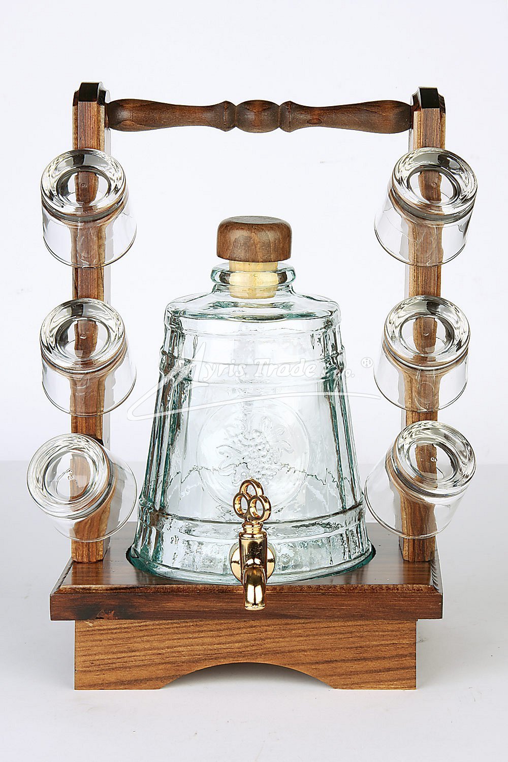 klasický skleněný soudek na alkohol s motivem hroznu, ve dřevěném podstavci, se šesti skleničkami, dřevěným ozdobným uzávěrem a funkční ozdobnou pípou