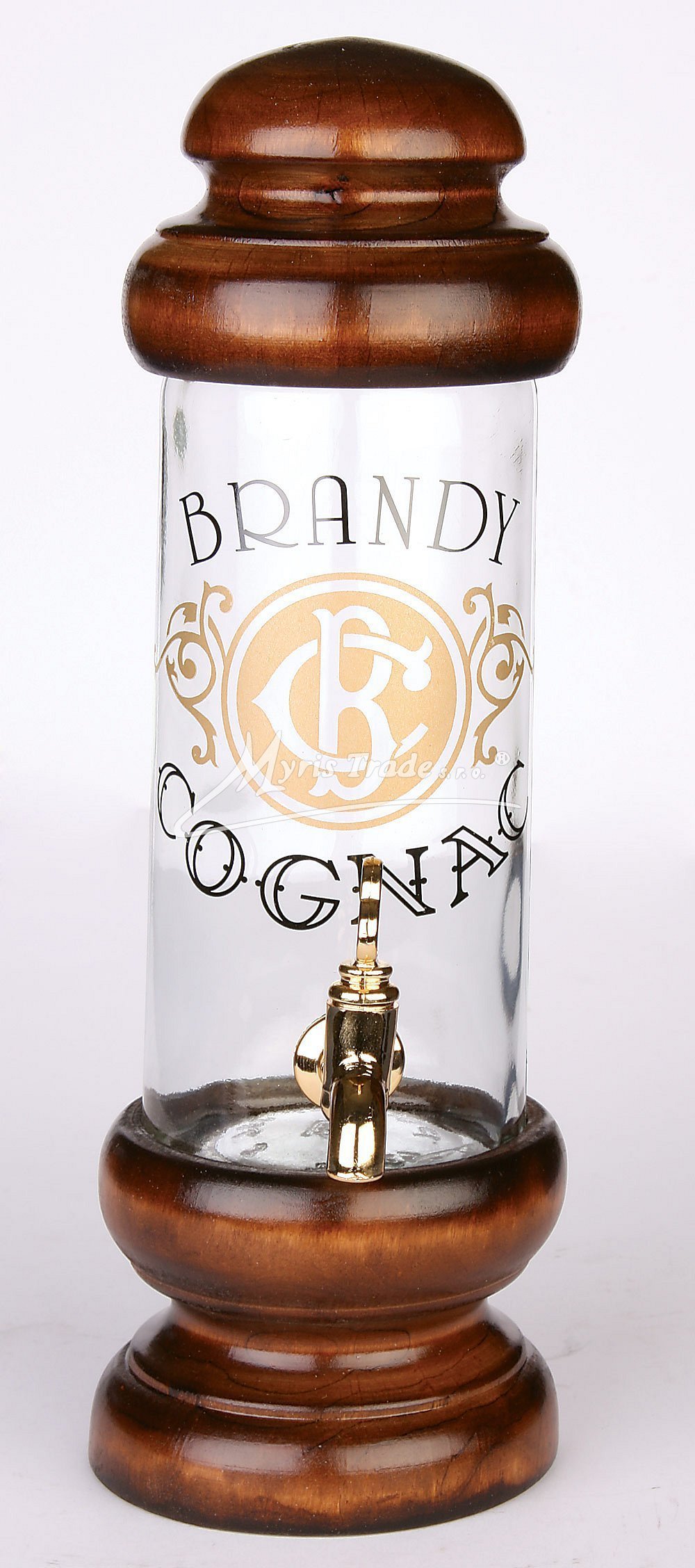 klasický skleněný zásobník na alkohol ve dřevěném podstavci, se dřevěným ozdobným uzávěrem a funkční ozdobnou pípou