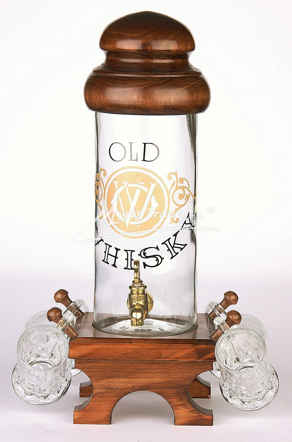 klasický skleněný zásobník na alkohol ve dřevěném podstavci se čtyřmi džbánečky, dřevěným ozdobným uzávěrem a funkční ozdobnou pípou