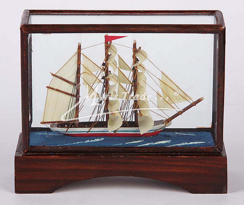 malý model plachetnice ve skleněné vitríně s dřevěným podstavcem
