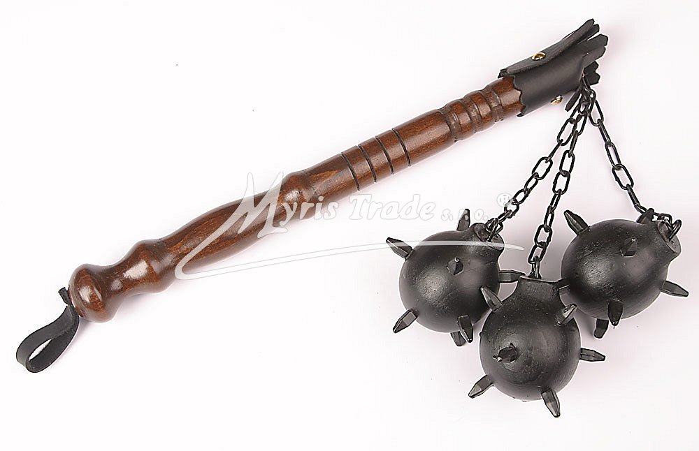 historická replika řemdichu s dřevěnou rukojetí a třemi koulemi, vyrobenými ze dřeva
