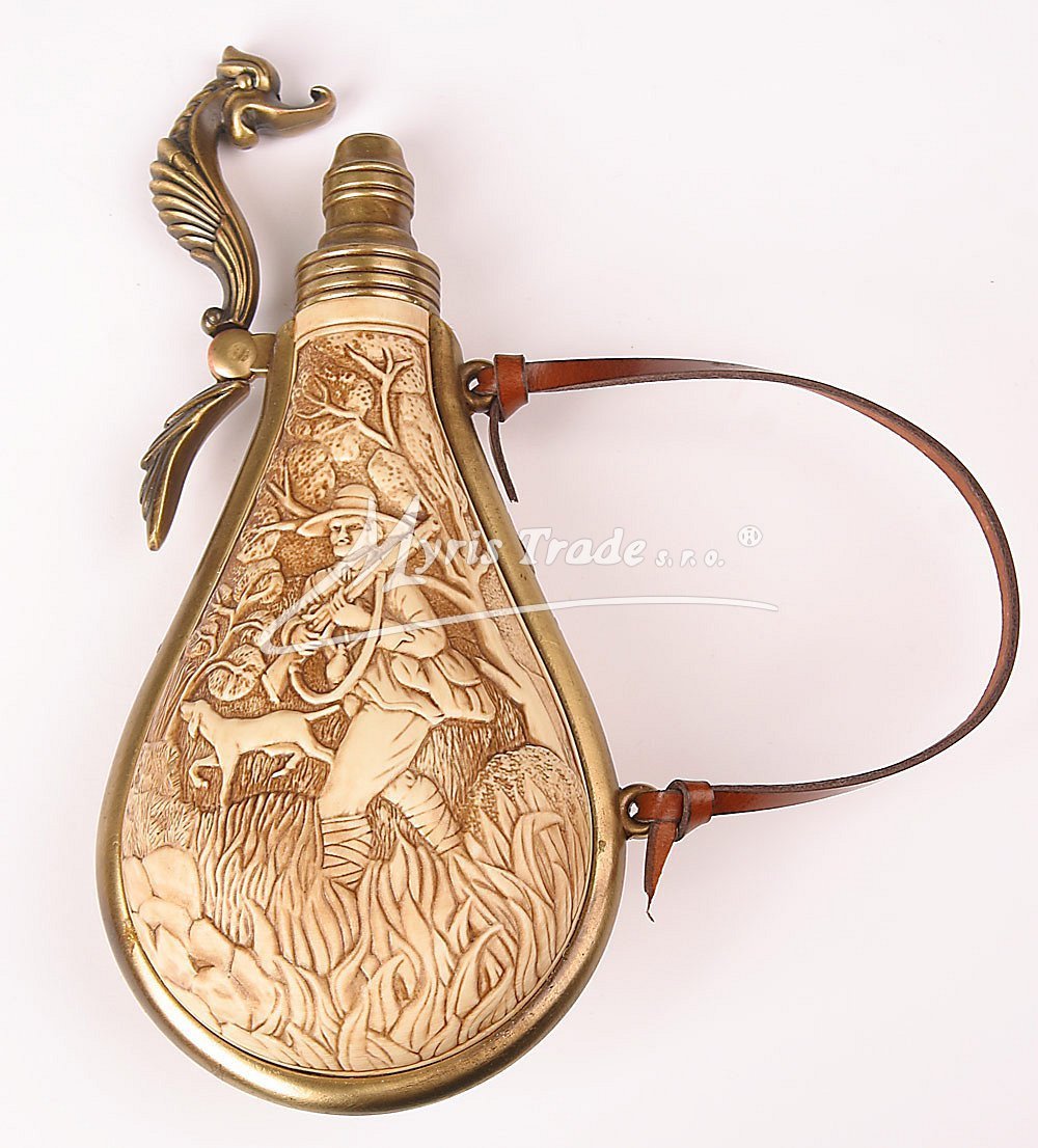 replika historické prachovnice je vyrobená z šedého kovu a plastu imitujícího slonovou kost a je bohatě zdobená loveckými výjevy