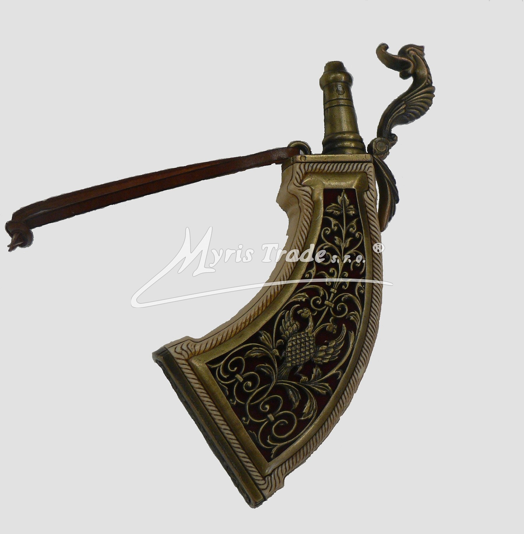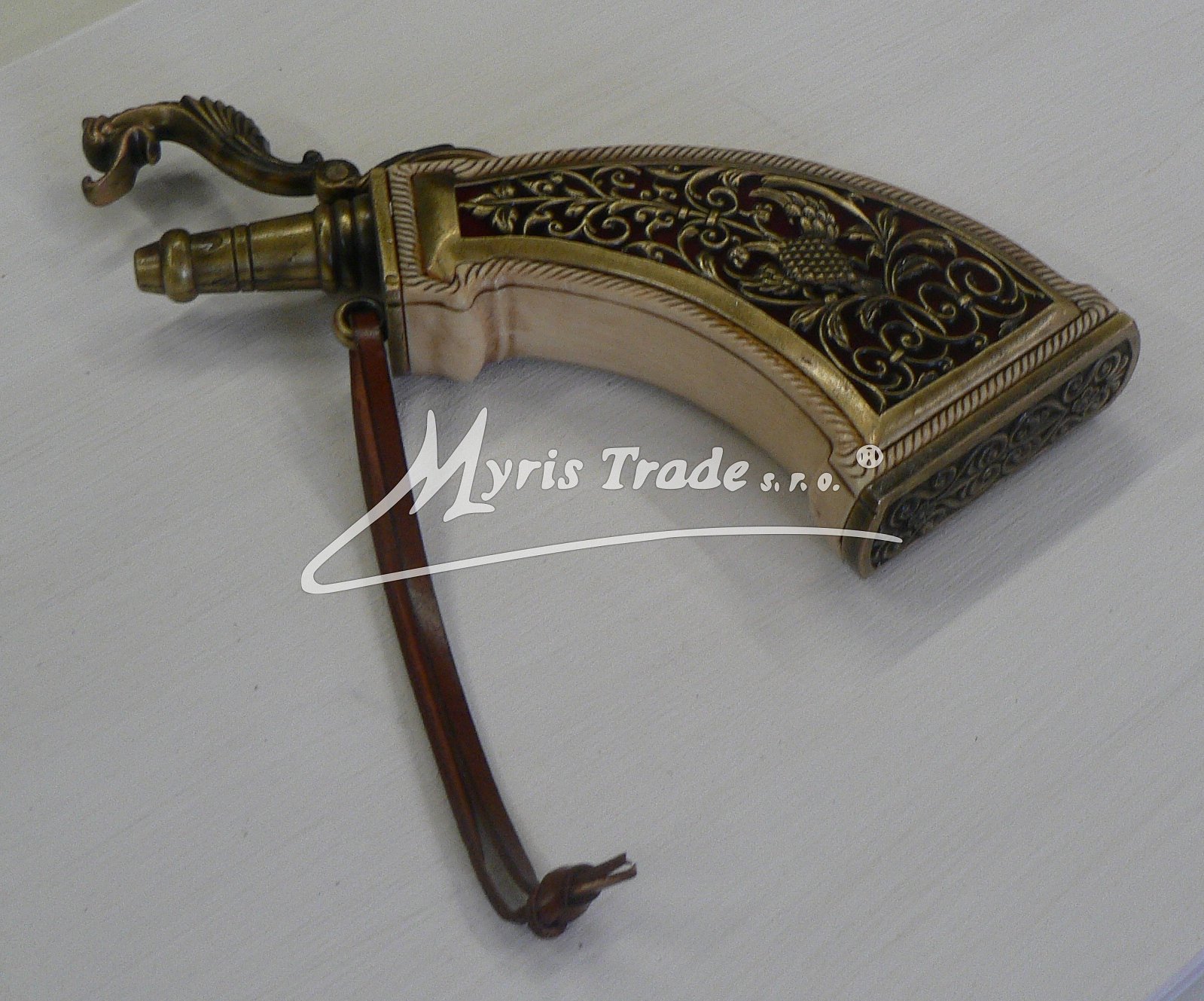 replika historické prachovnice je vyrobená z kovu barvy bronzu a plastu dokonale imitujícího dřevo a je bohatě zdobená