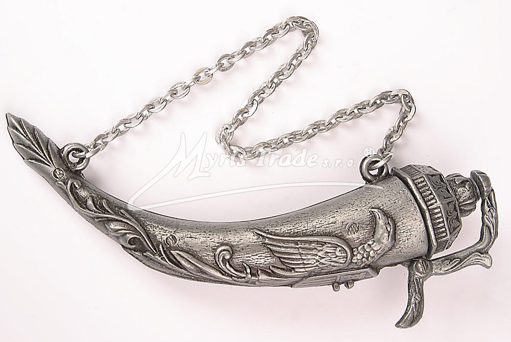 celokovová replika historické prachovnice je bohatě zdobená loveckými motivy